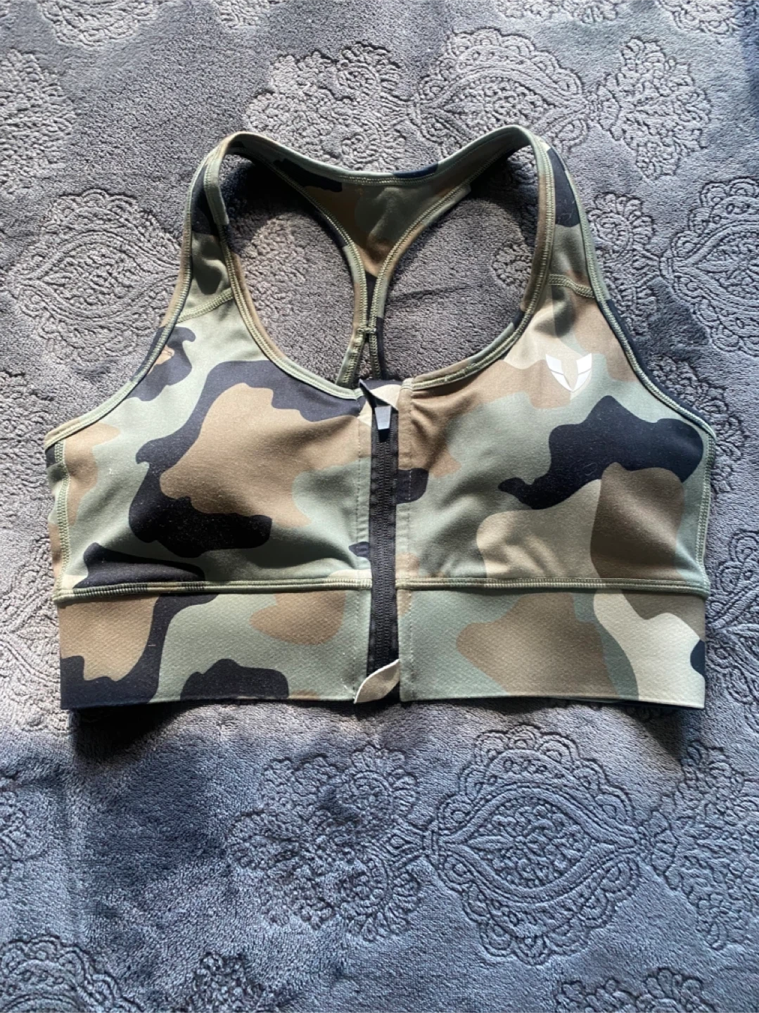 New Firmabs sports bra with a cool camo pattern! It features a zip-up front and is never worn. . Perfect for workouts or everyday wear. Fits a med frame as well