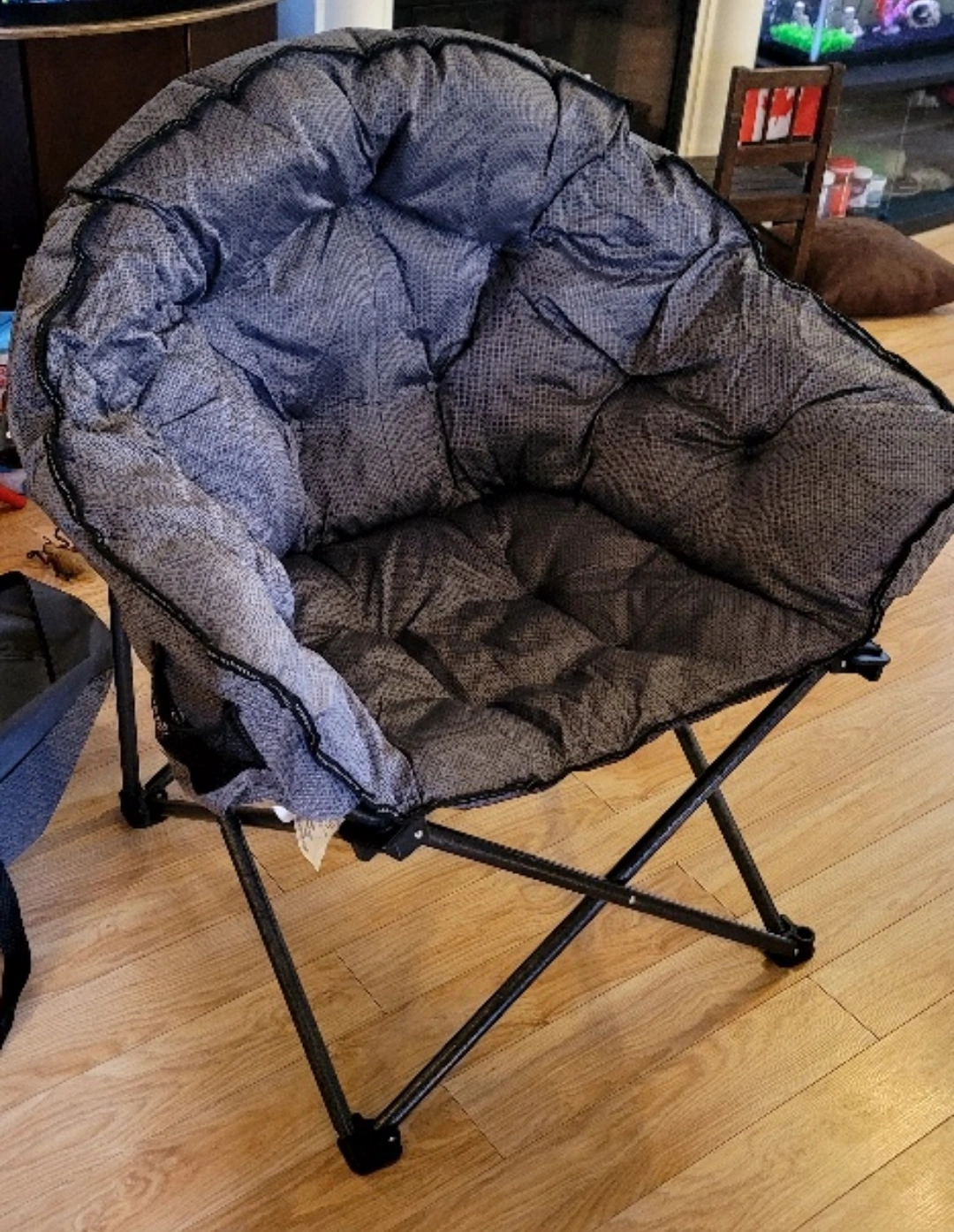 Selling a comfy, oversized moon chair! It's in great shape and perfect for relaxing indoors or outdoors. The chair has a padded seat and back for extra comfort, and it comes with a convenient cup holder. Easy to fold up and store when not in use