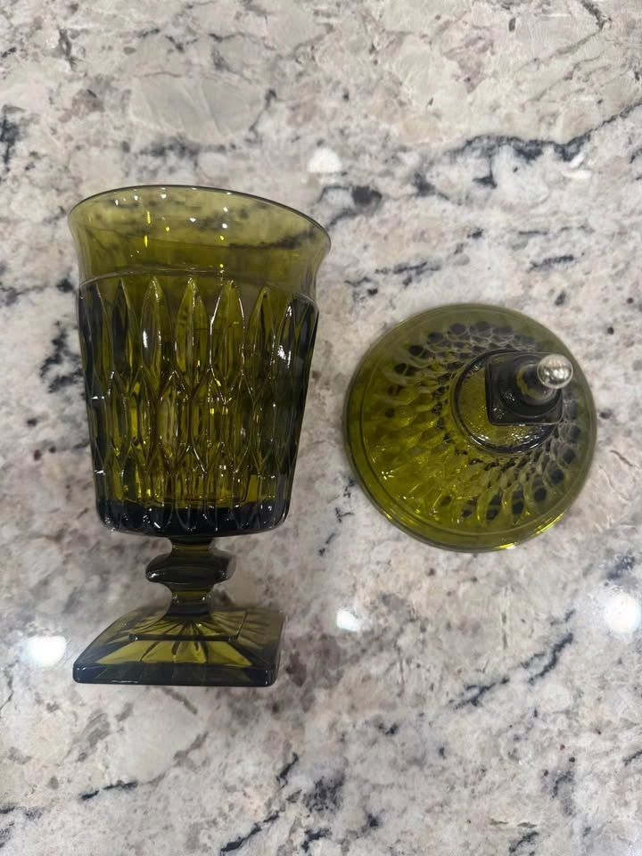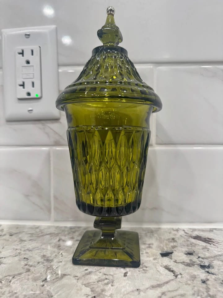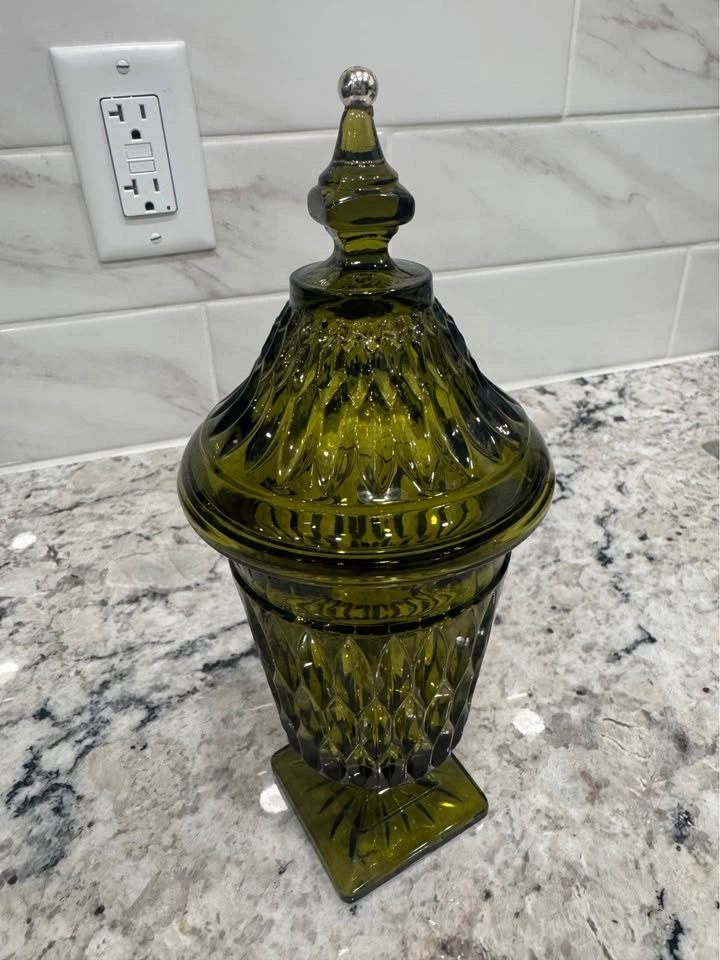 Beautiful lidded vintage glass container could be used for limitless possibilities. Candies, cotton balls, guest soaps, would be elegantly presented or stored. Excellent condition. First person to pick up. Cash only please