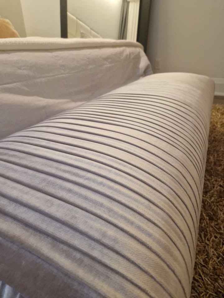 Beautiful light grey (pearl grey) velvet bench in excellent condition — looks like new. The only detail is that one leg is loose and needs to be repaired. Perfect to place at the end of the bed. Pick up 1080 bay st