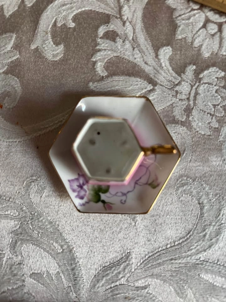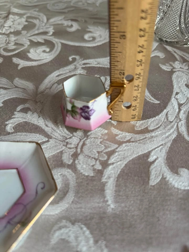 This vintage miniature teacup and saucer set from the “Occupied Japan” period (1845-1952) after WWII when Japan was under Allied occupation, highly collectible due to their historical context and the relatively short period of production. This Victorian style set is made of fine porcelain, hand painted with a floral motif and has gold trim around the edges and the handle. The saucer is approximately 3” in diameter and the teacup is about 1.5” tall. No flaws or issues. Cash only please. No holds. PFSF home. Just off of Birchmount Road between Kingston Road and Danforth