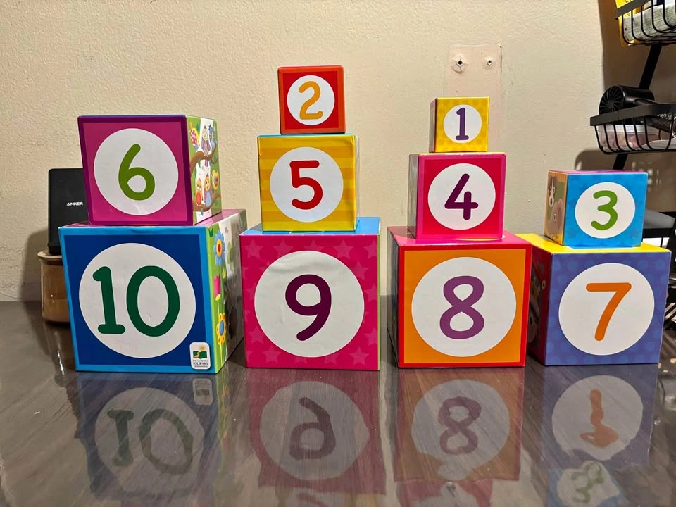 12This is a Towering Learning Set that comes with multiple sizes of cardboard cubes. Each cube has there own unique design (number,a background setting or food or animal!) These cubes also create a trail when stacked up together!