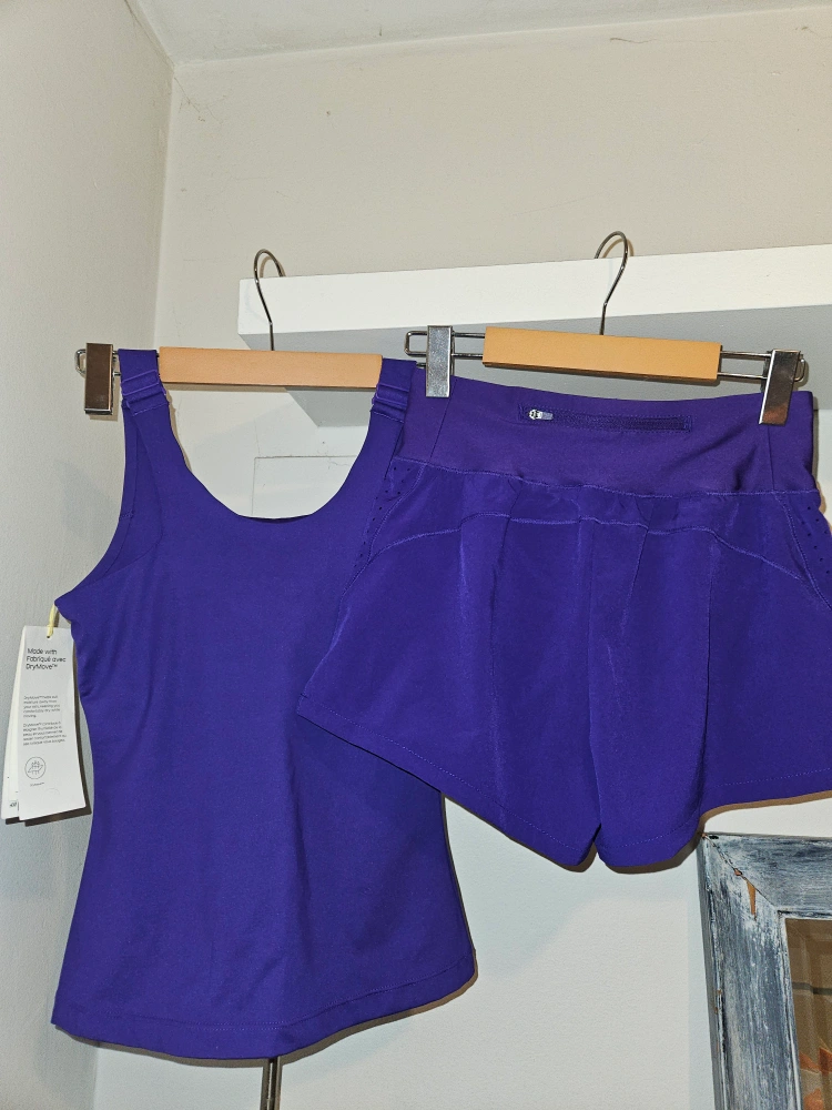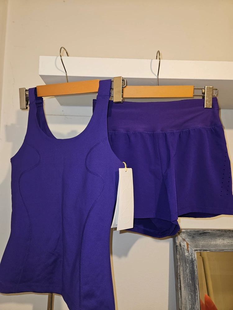 Selling an athletic set in a beautiful purple colour! The set includes a shelf-bra sports top with SoftMove and a short. Perfect for tennis, running, or any workout. The material is lightweight and comfortable. Feel free to message me with questions!
