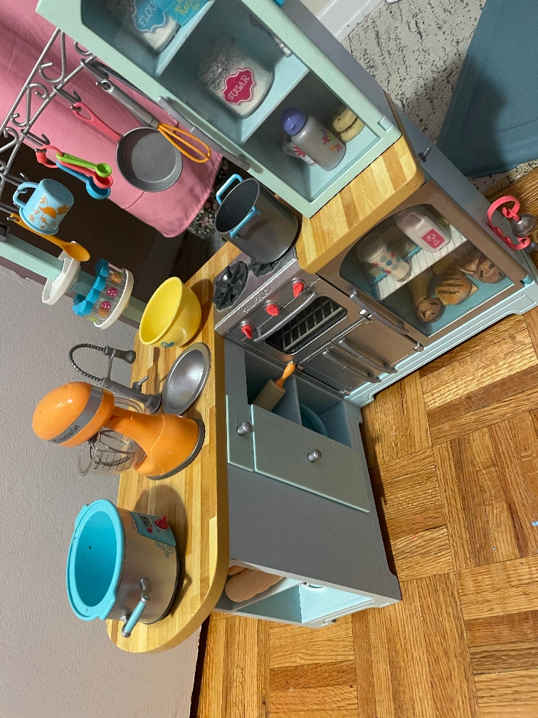 Selling a used American Girl kitchen set with accessories. It's in great condition and ready for a new home! Includes a variety of kitchen utensils, cookware, and play food items.