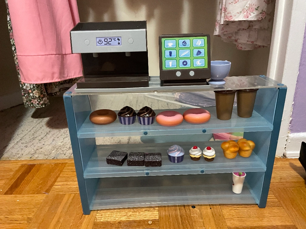 Selling a cute toy coffee stand! It comes with a coffee maker, a screen with different food options, and lots of yummy-looking treats like donuts, cupcakes, and brownies. Perfect for pretend play!