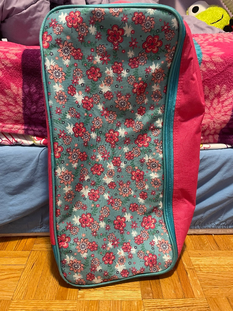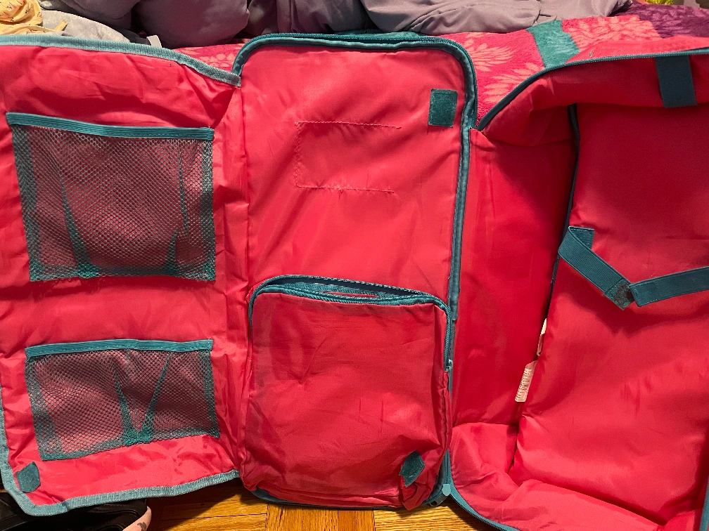 Doll travel bag — perfect for storing and carrying your doll and accessories! Features include: Soft padded interior to protect your doll Two mesh pockets for clothes and accessories One large zip compartment for shoes or extras Secure straps to hold doll in place Easy fold-and-carry design with handle and Velcro closures