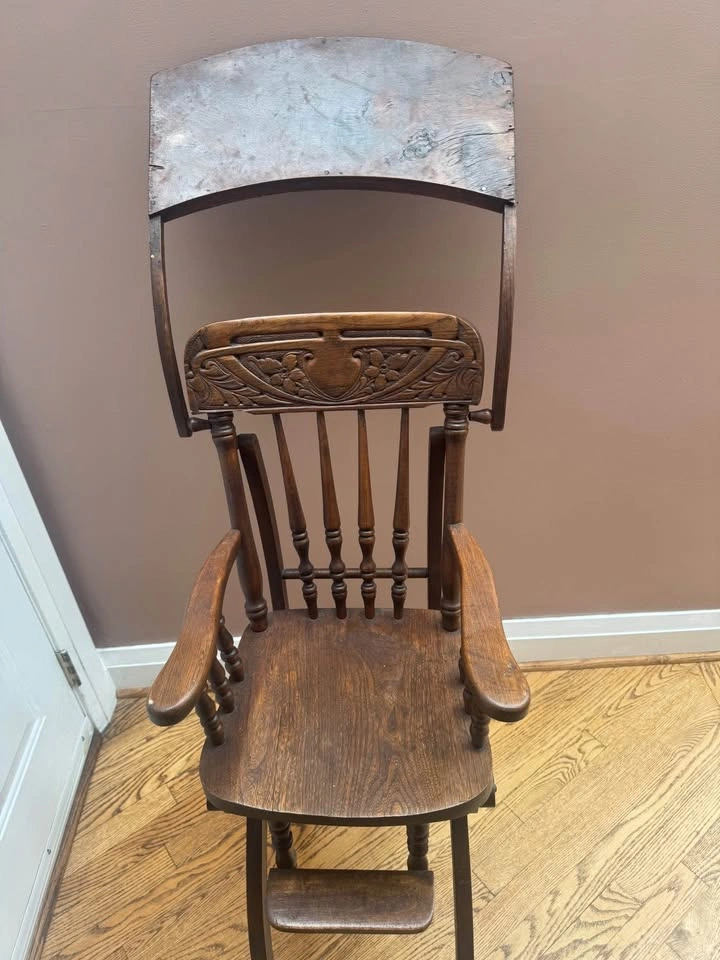 Antique solid wood pressed back high chair with four cast iron wheels that render it extremely moveable. Easily converts to a walker or stroller with a simple press lever release. See photos. It has hand carved floral detail on the head board. It is in good vintage condition, showing some wear and age actually enhancing its vintage charm. The high chair is 39 1/2 inches tall at the back. From wheel to wheel across the front is about 14 inches. From the front wheel to the back wheel down the side measures 27 inches. This wonderful chair would make a unique plant stand. It could also be used as a conversation piece to display collectible dolls or teddy bears. Cash only please. No holds. Pick up in the Birchmount and Kingston Rd area.
