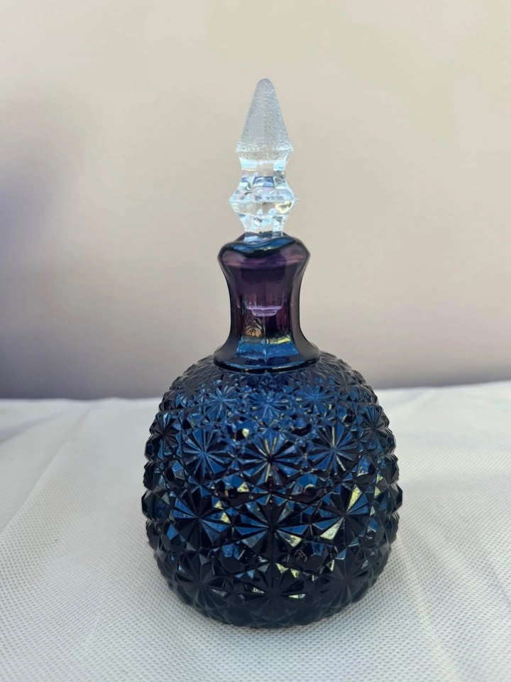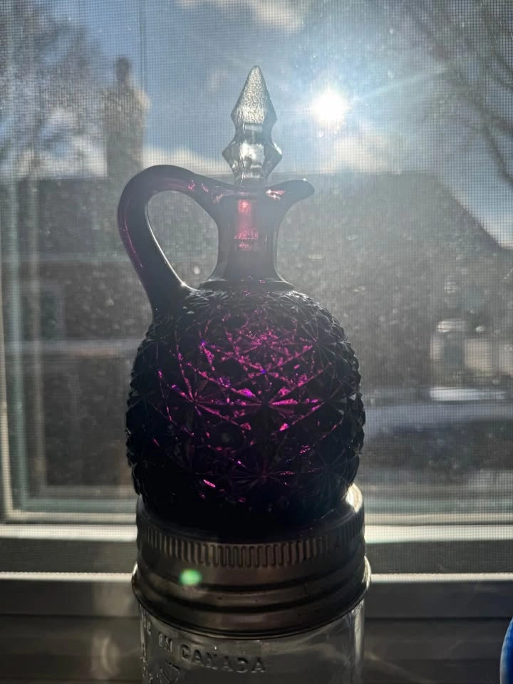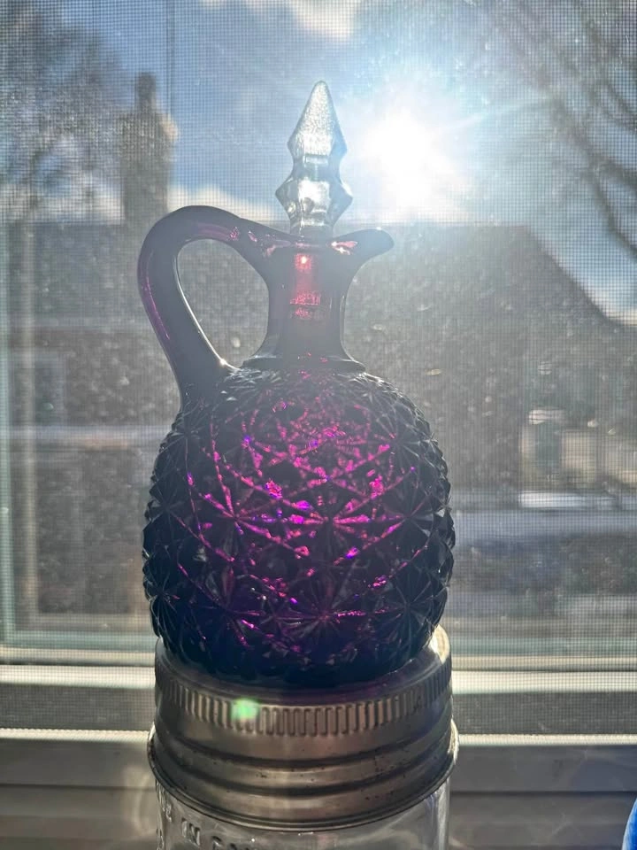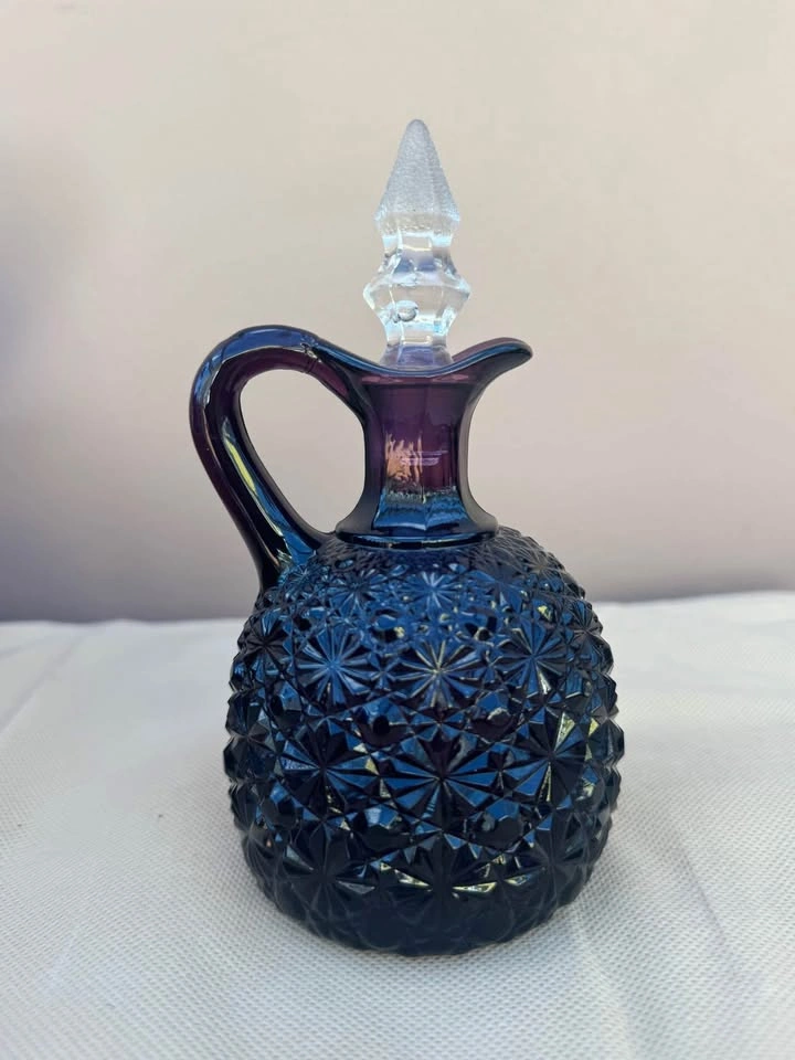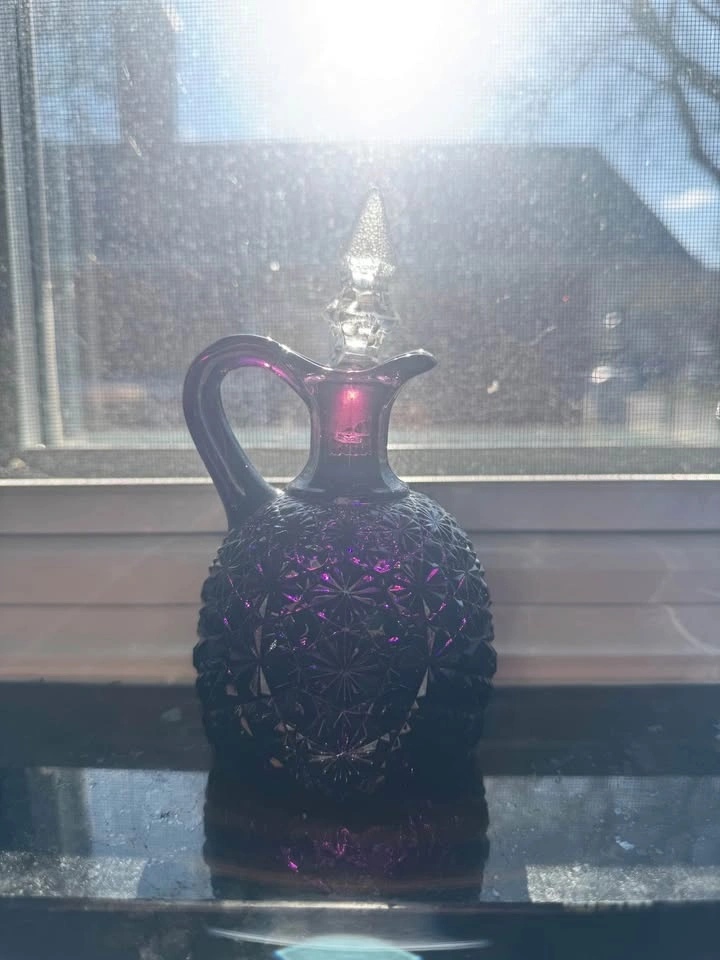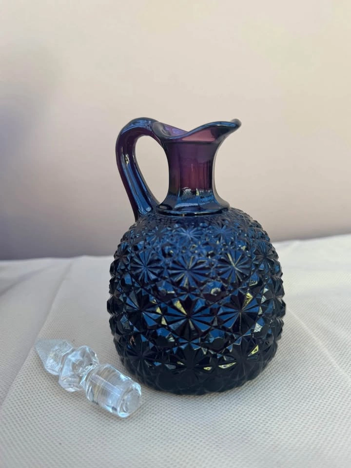 10Beautiful Fenton for L.G.Wright Co. Daisy and Button pattern small decanter or cruet with stopper. Gorgeous amethyst coloured pressed glass. Rare find. Collectable. Excellent condition. Approximately 6 inches high with stopper, 3 1/4 inches wide. Cash only please. No holds. Birchmount and Kingston Rd area.