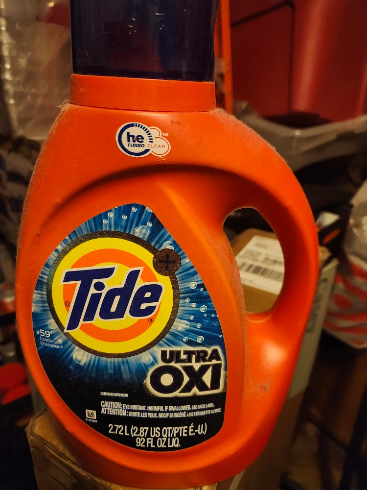Selling a bottle of Tide Ultra Oxi laundry detergent. It's a large 92 fl oz bottle, good for 59 loads. The bottle features he Turbo Clean technology, and the formula includes Ultra Oxi for stain removal