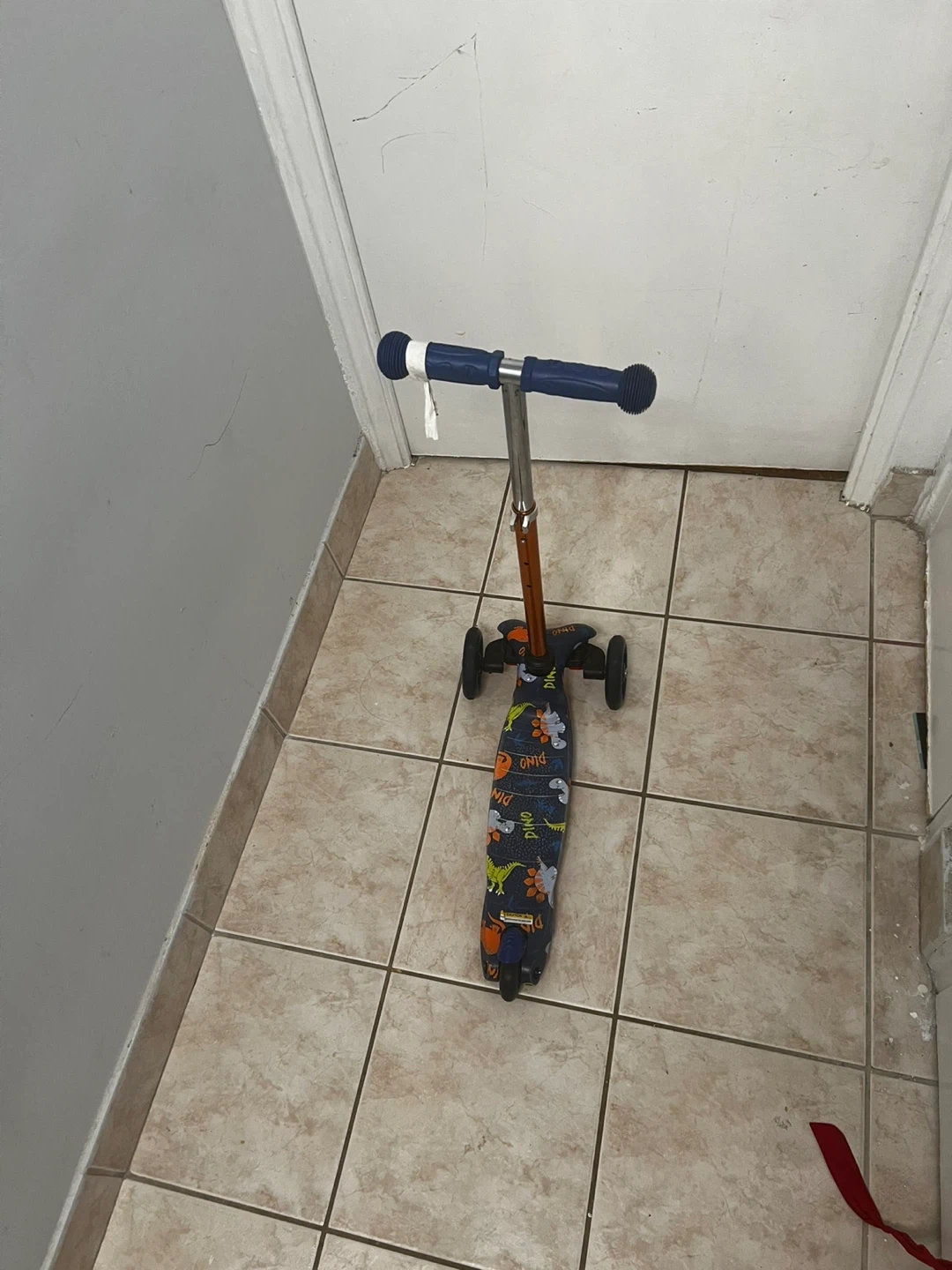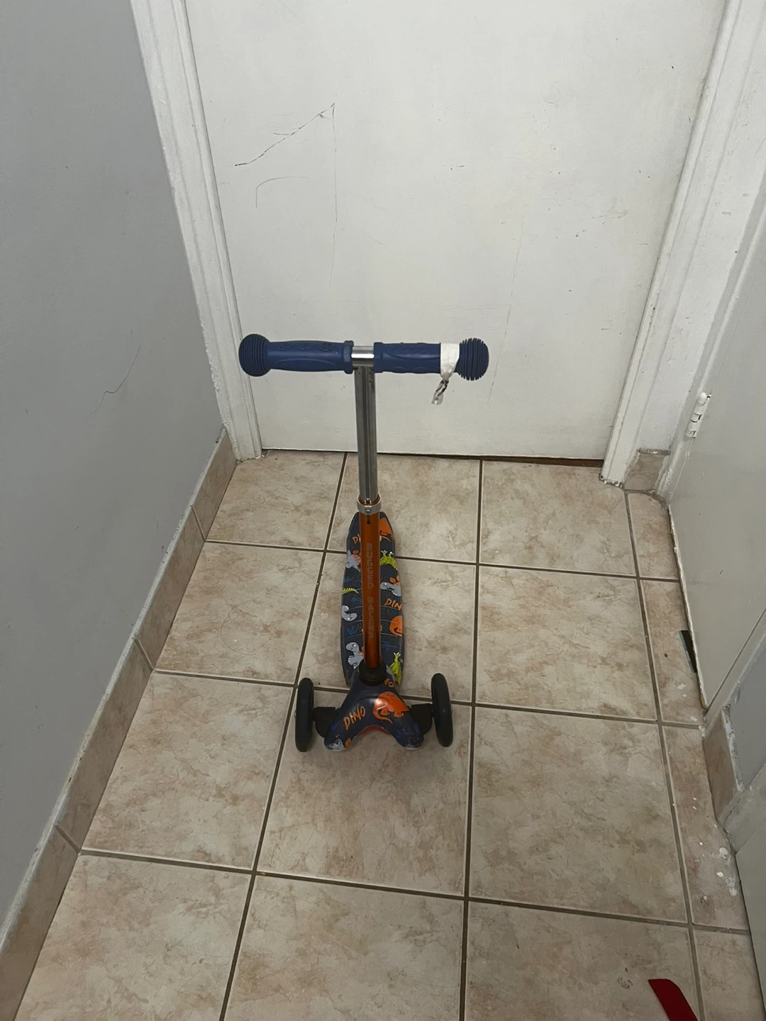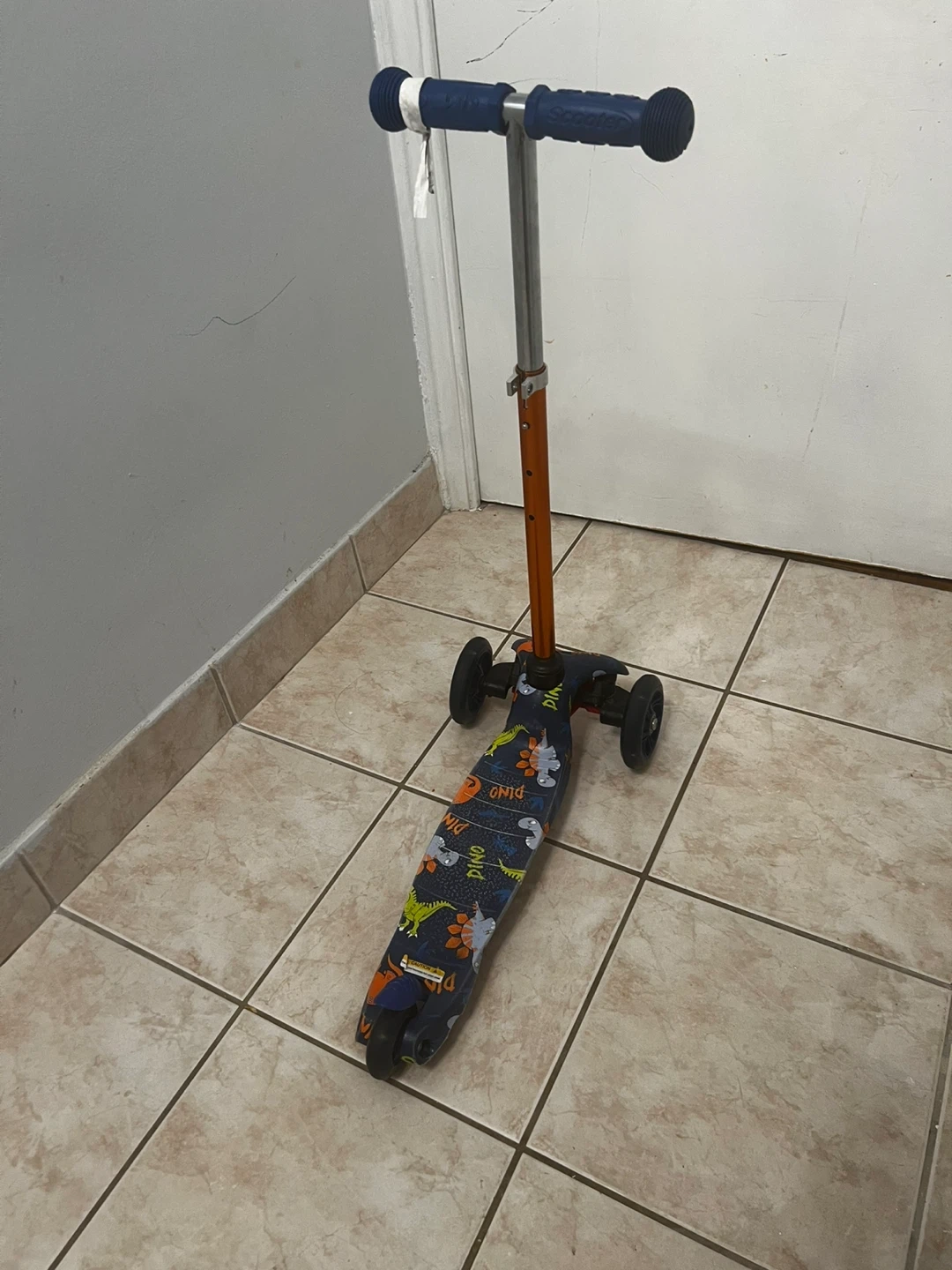 67Here's a cute little scooter with a dino pattern! It's a three-wheel scooter, perfect for kids who are still learning to balance. The handlebar grips are blue, and the frame is orange. It's in good condition