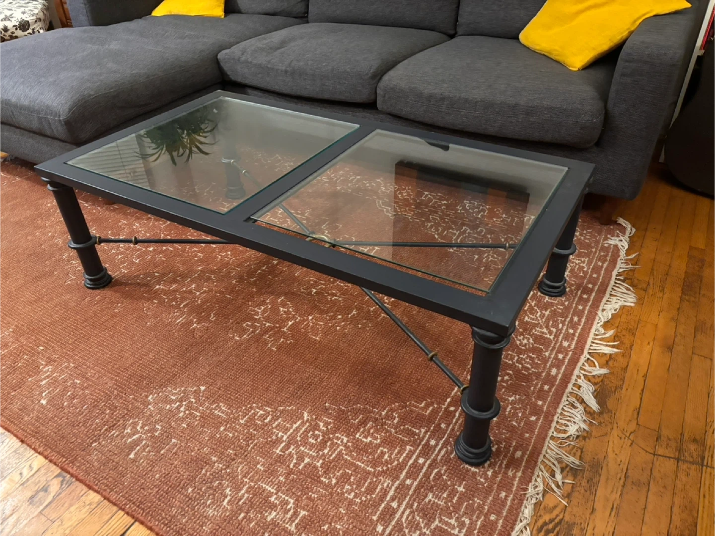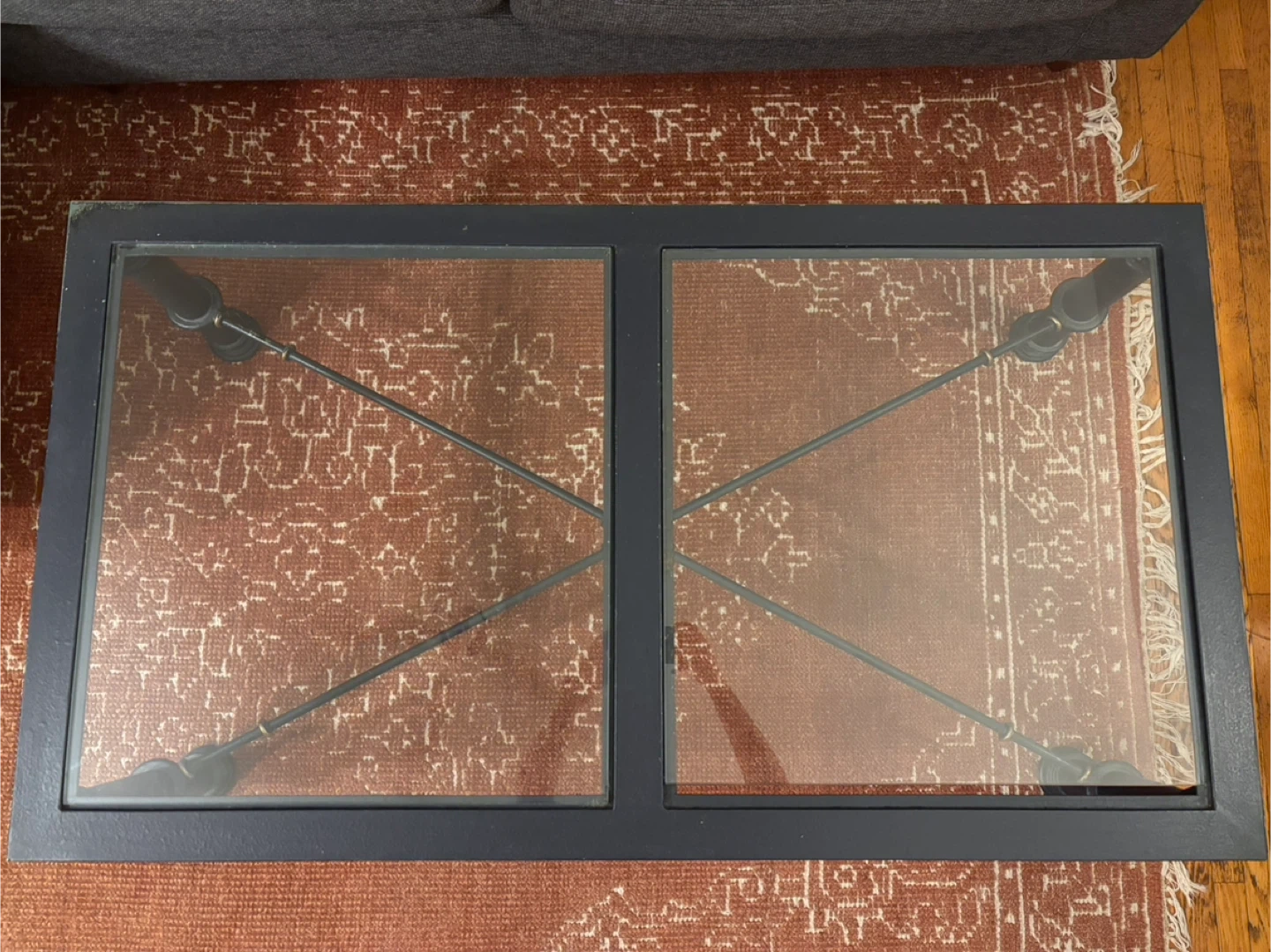 Navy blue with gold painted details and glass panels. This is a great coffee table, but it's time to say goodbye. I'm pretty sure it's iron, sturdy base with a nice little foot rest. One glass panel does not fit perfectly, but the other fits snug. I've used it indoors for over a decade but it could also be used outside, this table will outlive me. It is so hearty.