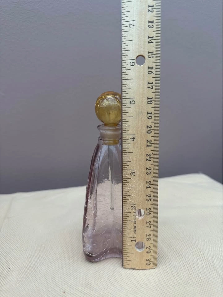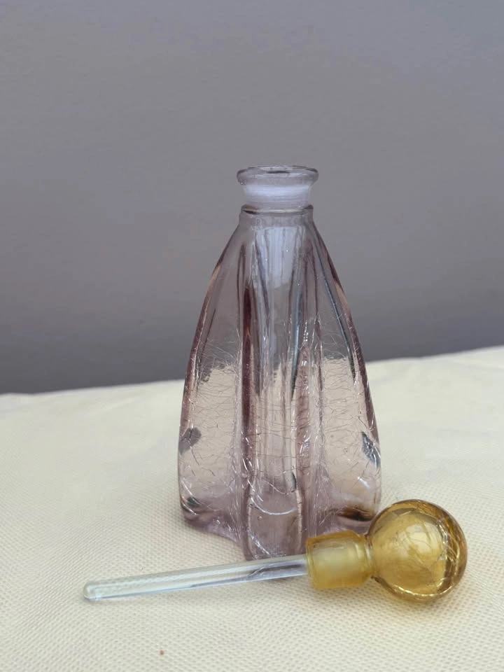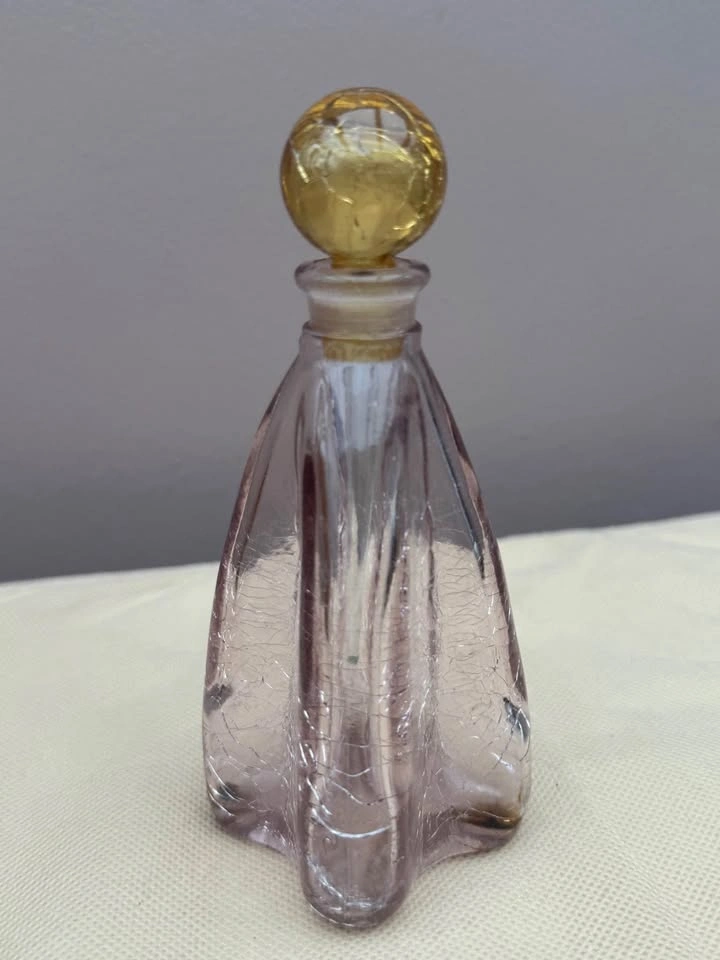 Beautiful crackle glass perfume bottle collectable. Approximately 5 1/4 inches tall. Cash only please. No holds.