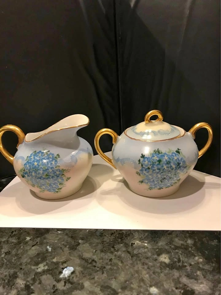 Hand painted forget-me-nots adorn this sweet and elegant cream and sugar set. Vintage, one of a kind. This will be the highlight of your next tea party.