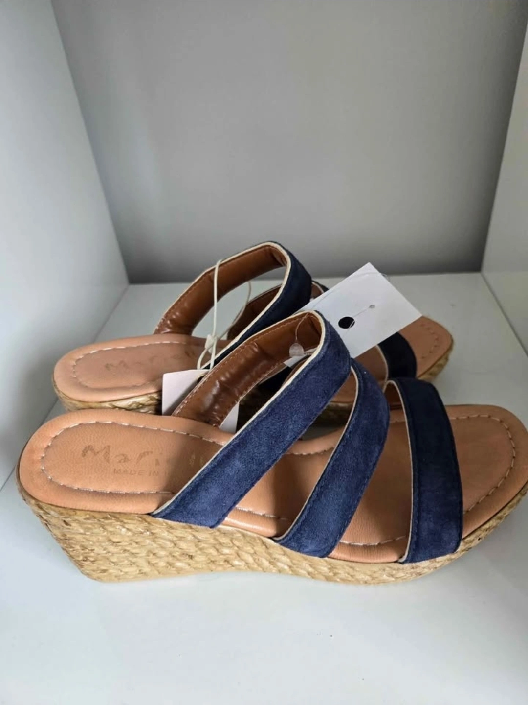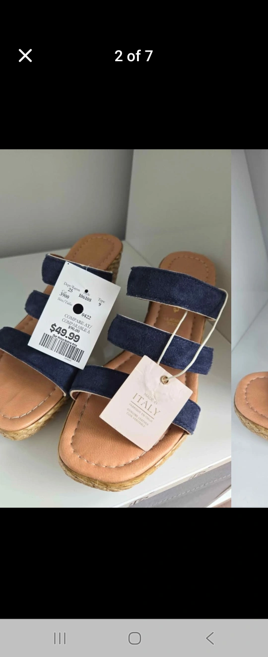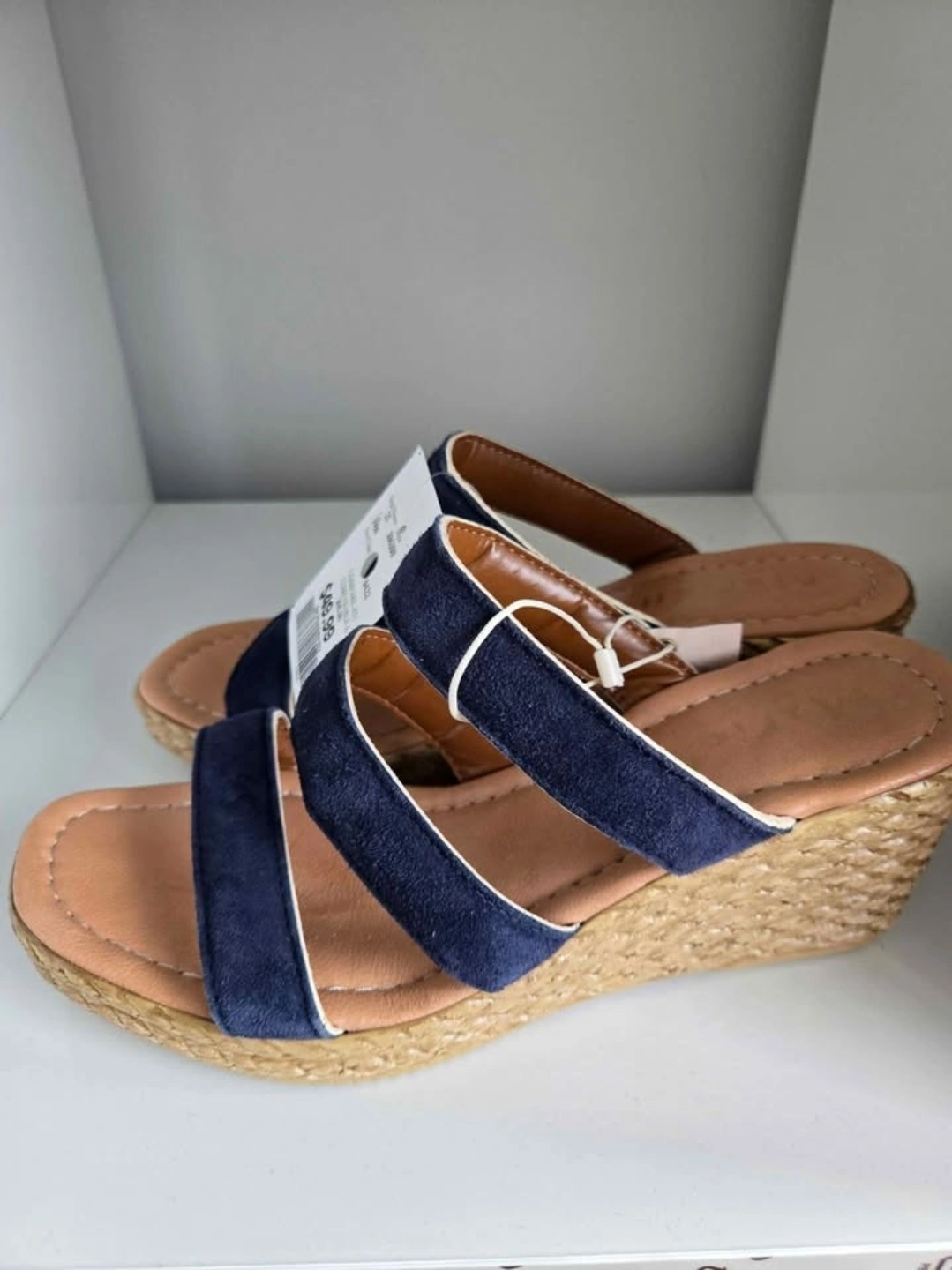 These cute Italian wedge sandals feature a stylish blue colour. They are a size 7.5. The tag shows they were originally $49.99 at Marshall's.