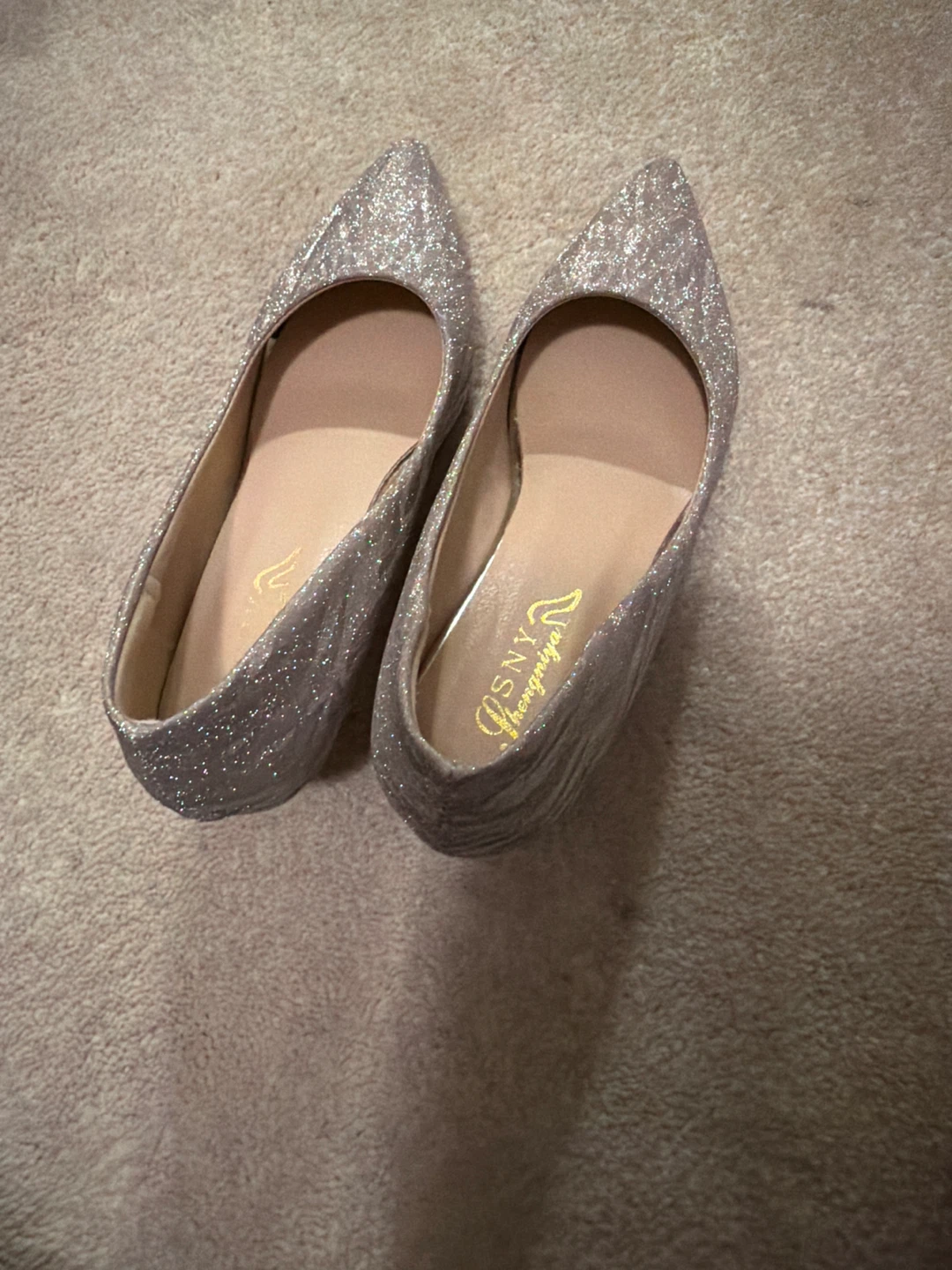 Selling a pair of sparkly silver heels! They're a size 6and have a cute, stylish design. Perfect for dressing up for a night out or a special occasion. They show some signs of wear on the soles, but otherwise are in good condition.