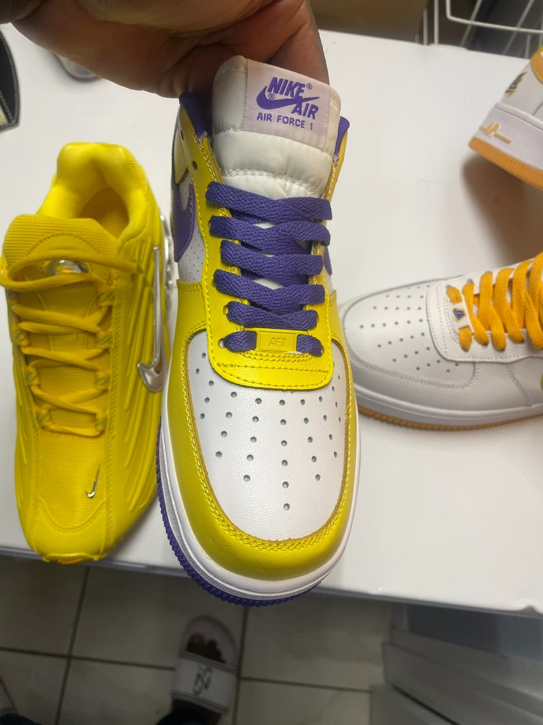 Selling a pair of Nike Air Force 1 shoes in the Kobe Lakers colorway. These shoes feature a white base with yellow and purple accents, perfect for any Lakers fan. The design includes the classic Air Force 1 silhouette with the iconic Nike swoosh. They are in great condition and ready for a new home