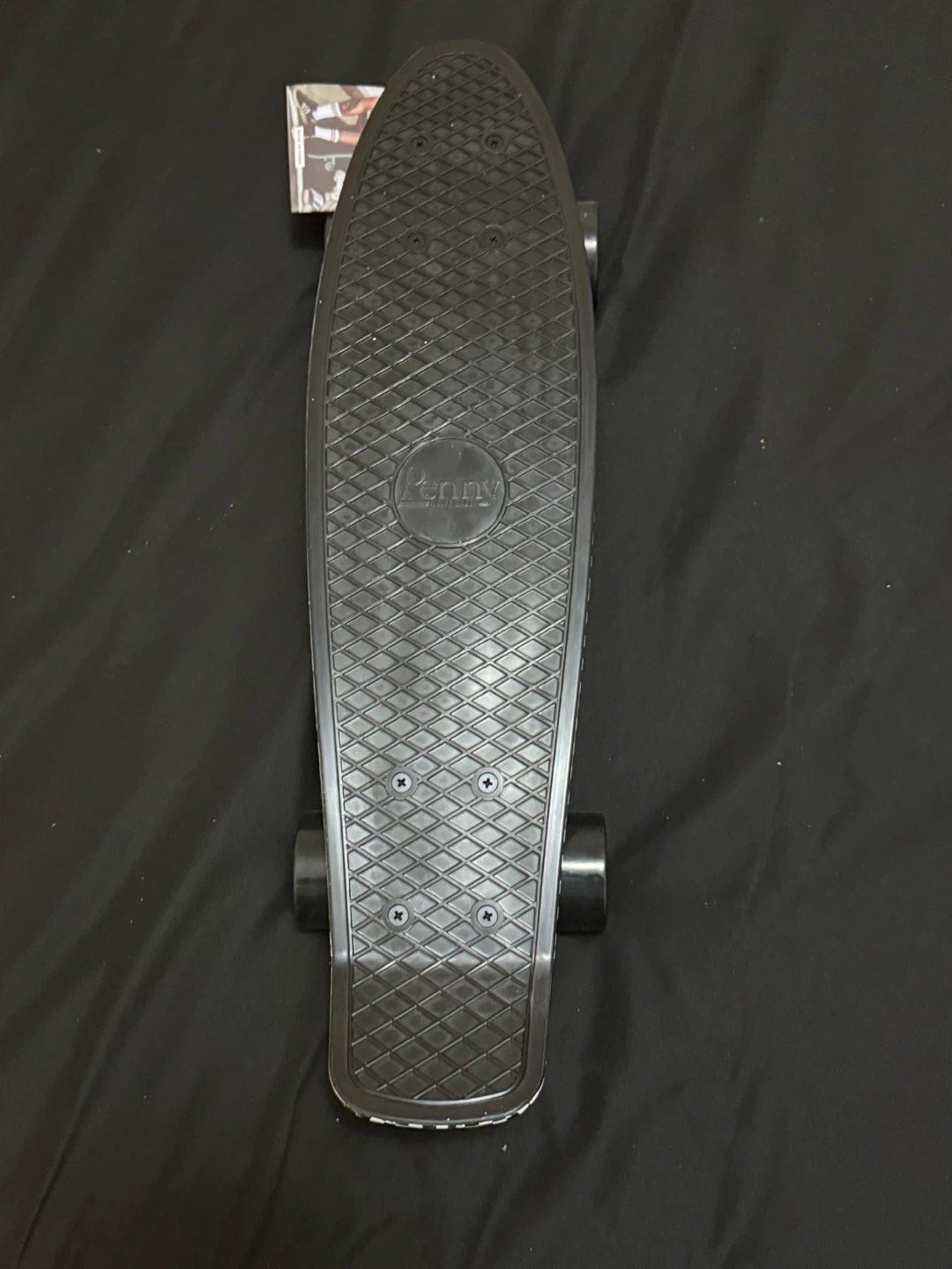 Selling a Penny skateboard with a cool flame design! It's in great shape and ready to ride. The deck has a black and white checkered pattern around the edges, and the Penny logo is visible on the board. Perfect for cruising around town!