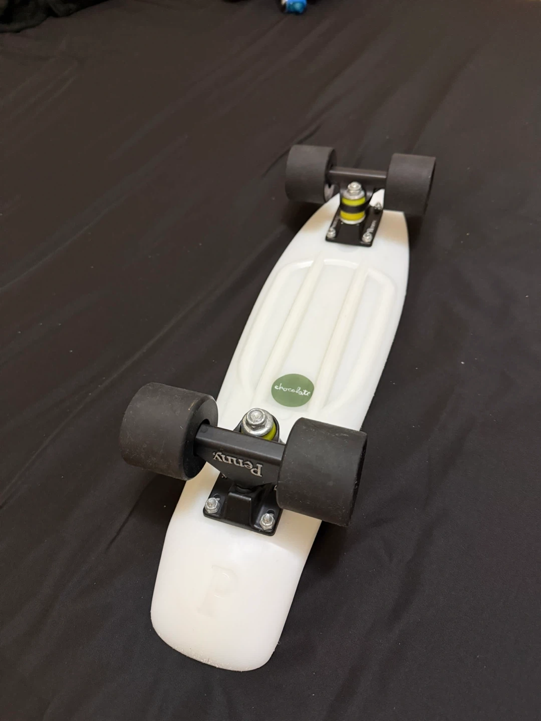 Selling a white Penny board skateboard! It's in great shape and ready to roll. Perfect for cruising around town or hitting up the skate park (Glow in the dark)