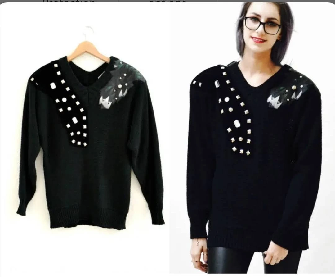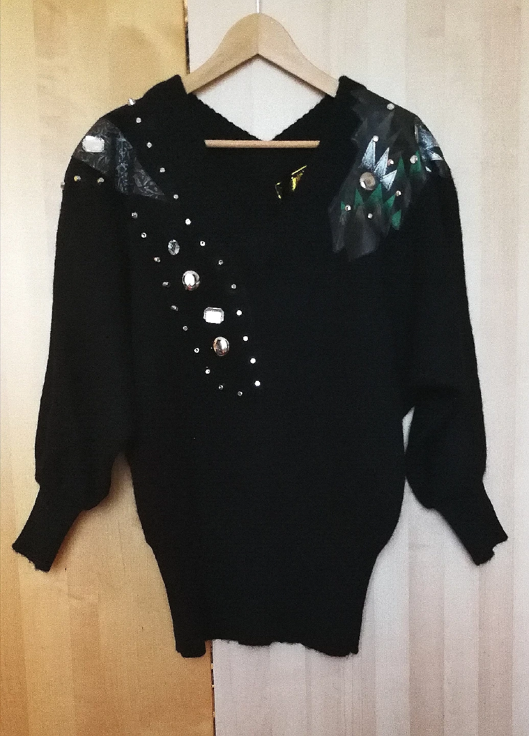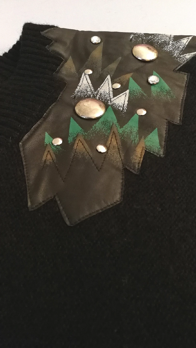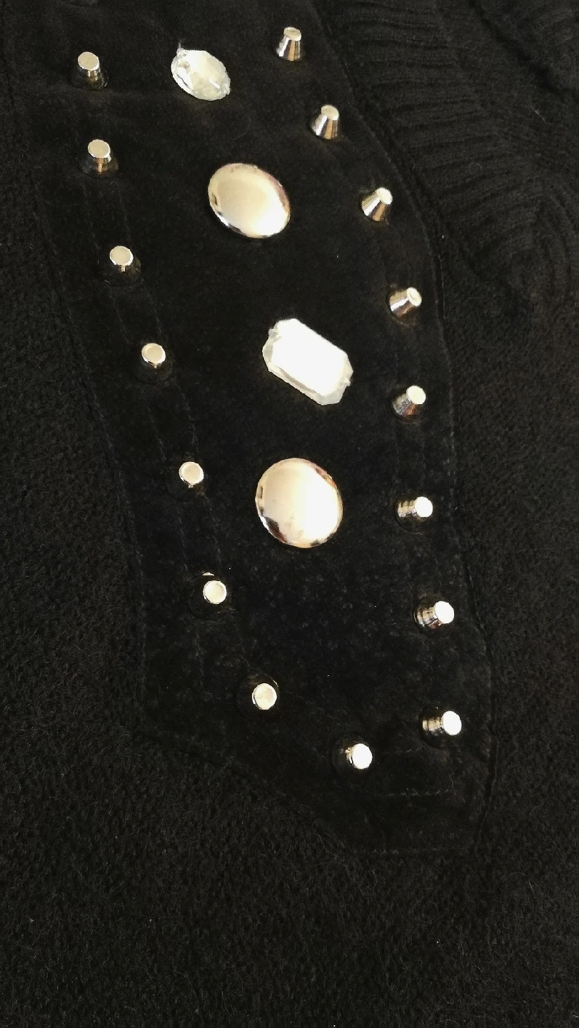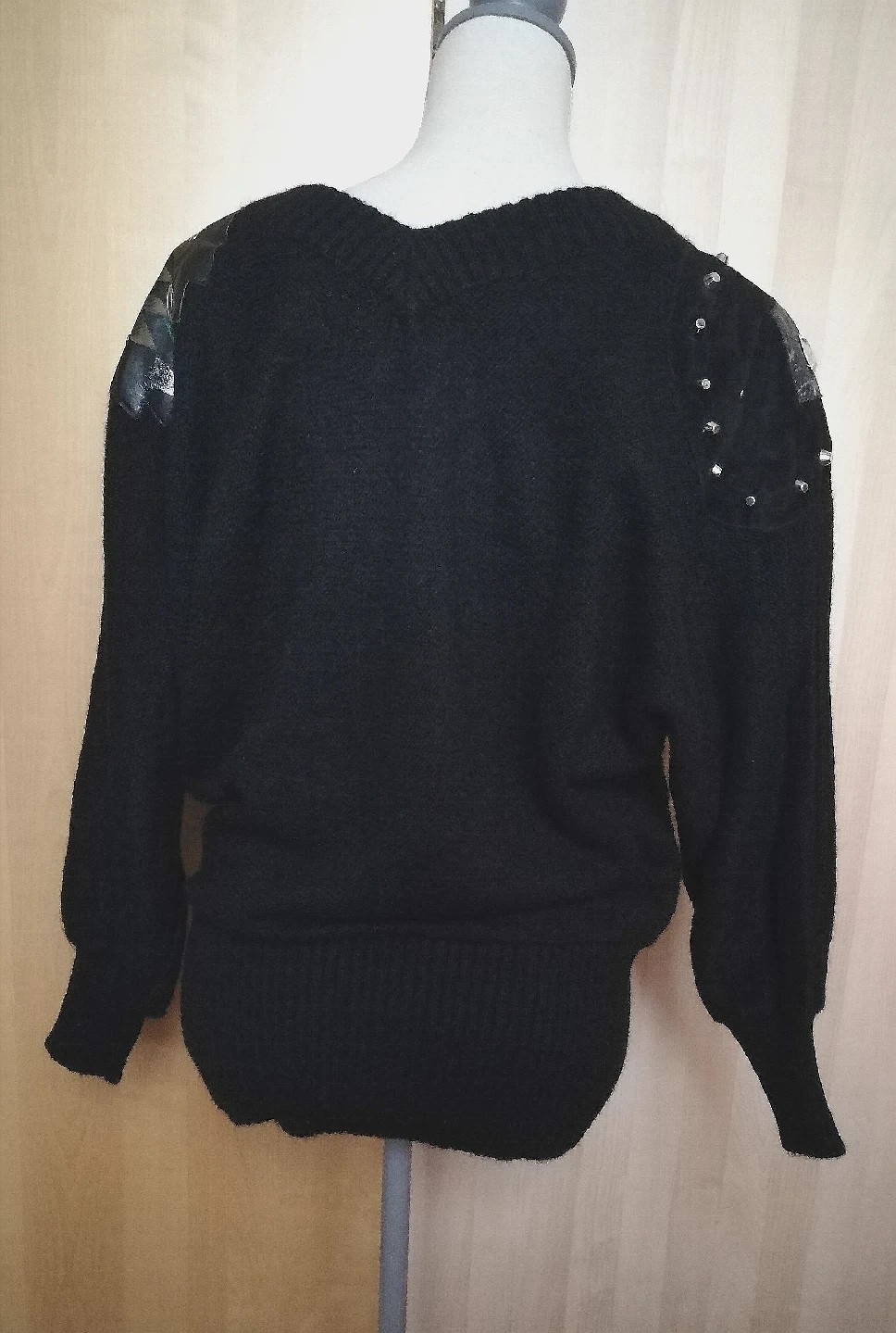 Unique vintage in 80's black kidmohair blend V-neck sweater with interesting embellishments, size S made in Italy, features in leather, gemstone and stud decorations and bat sleeves Serious inquiries please pick up in downtown close to St Patrick station, Dundas-University area
