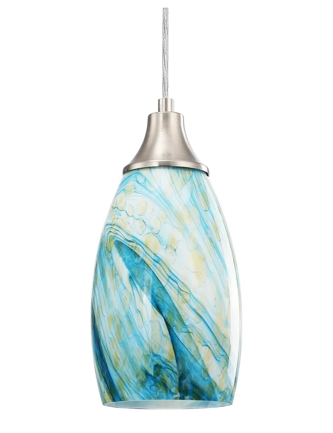 Add a touch of elegance to your home with this beautiful glass pendant light fixture! The swirling blue and yellow design adds a unique and stylish look to any room. Perfect for kitchens, dining rooms, or entryways, this pendant light will brighten up your space with its warm and inviting glow
