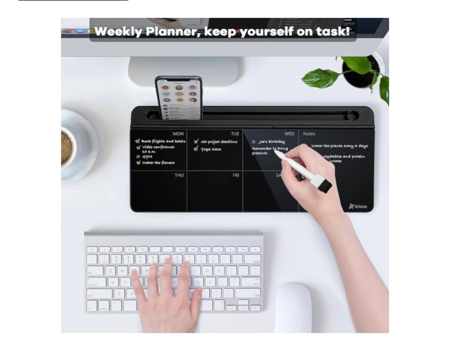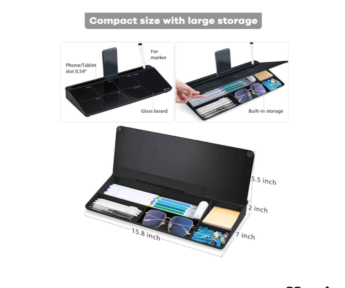 Keep yourself on task with this Verkstar weekly planner desk organizer! It has a compact size with large storage. It also has a phone/tablet slot and a place for a marker. The dimensions are 15.8 inches x 7 inches x 2 inches. The height is 5.5 inches.