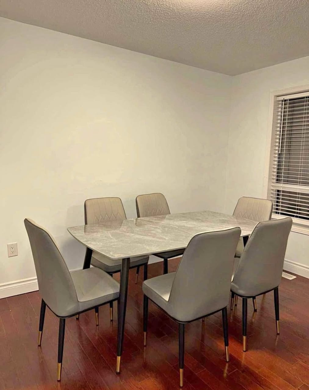 Selling a dining table with six chairs. The table has a marble-style top and the chairs are a stylish grey colour. Perfect for a modern dining room!