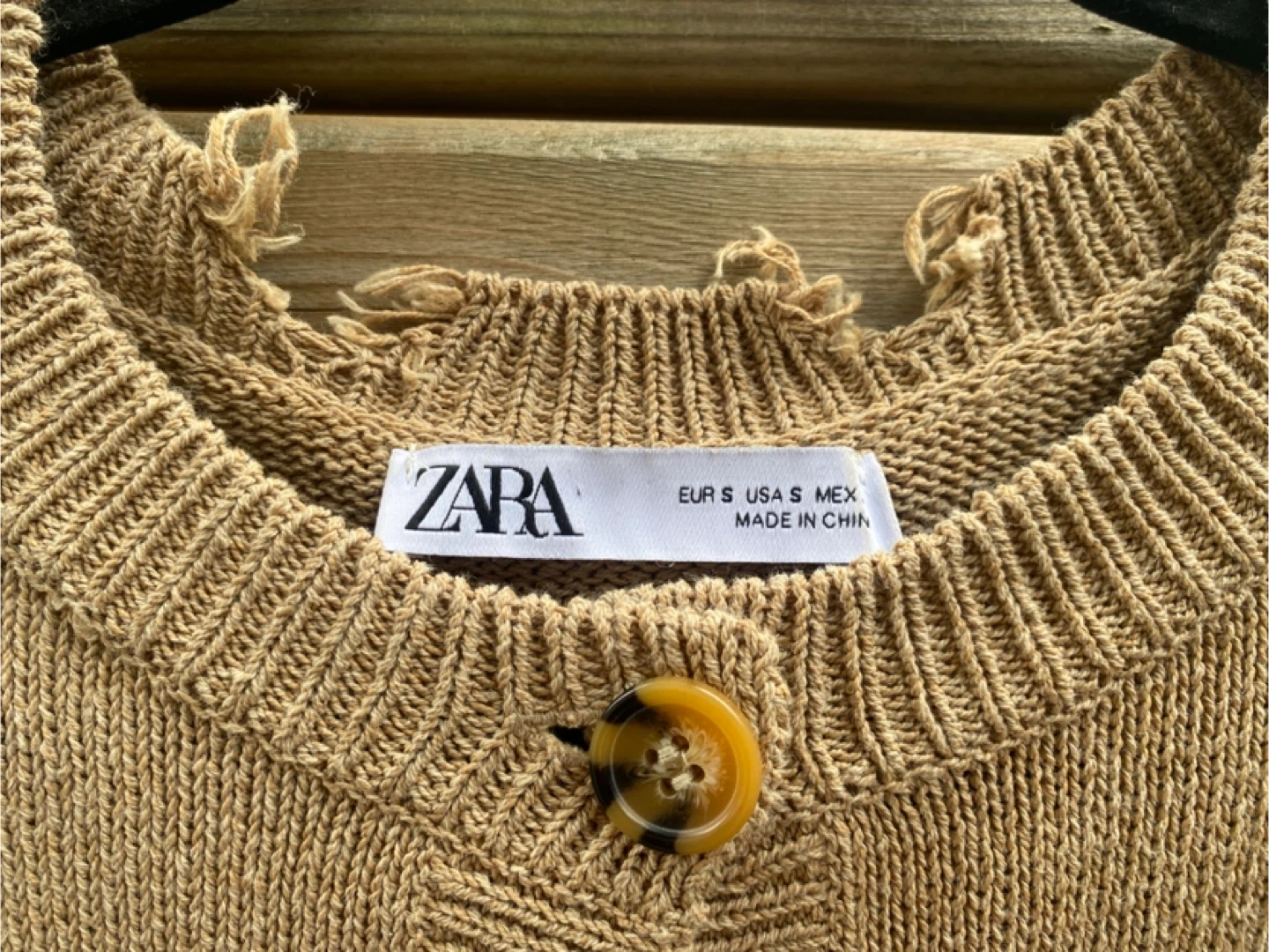 The Zara cardigan was designed to look distressed and the true colour of it is jn the photo showing just the sweater, It’s a size small