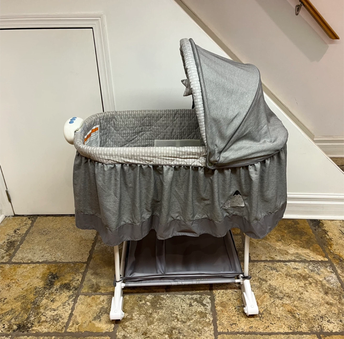 Baby Rocking Bassinette / Cradle with soothing vibrations, light and music - adjustable buttons Asking: $30 Paid: $140 new Condition: Very Good Colour: Artic Bear / Grey & White Brand: Bily Product Dimensions: 18.3L x 4W x 33H Centimetres Maximum weight recommendation: 18 Pounds Form factor Moses Basket Bassinet For babies unable to roll over, up to 18 lbs. And 3 months old or less Rocking or stationary bassinet with Retractable casters to rock or keep stationary Adjustable canopy with 2 soft toys. Hand washable canopy Two dangling stars Pad & Sheet Included Sheet recently washed Large storage basket below Recently cleaned Midtown Toronto Location