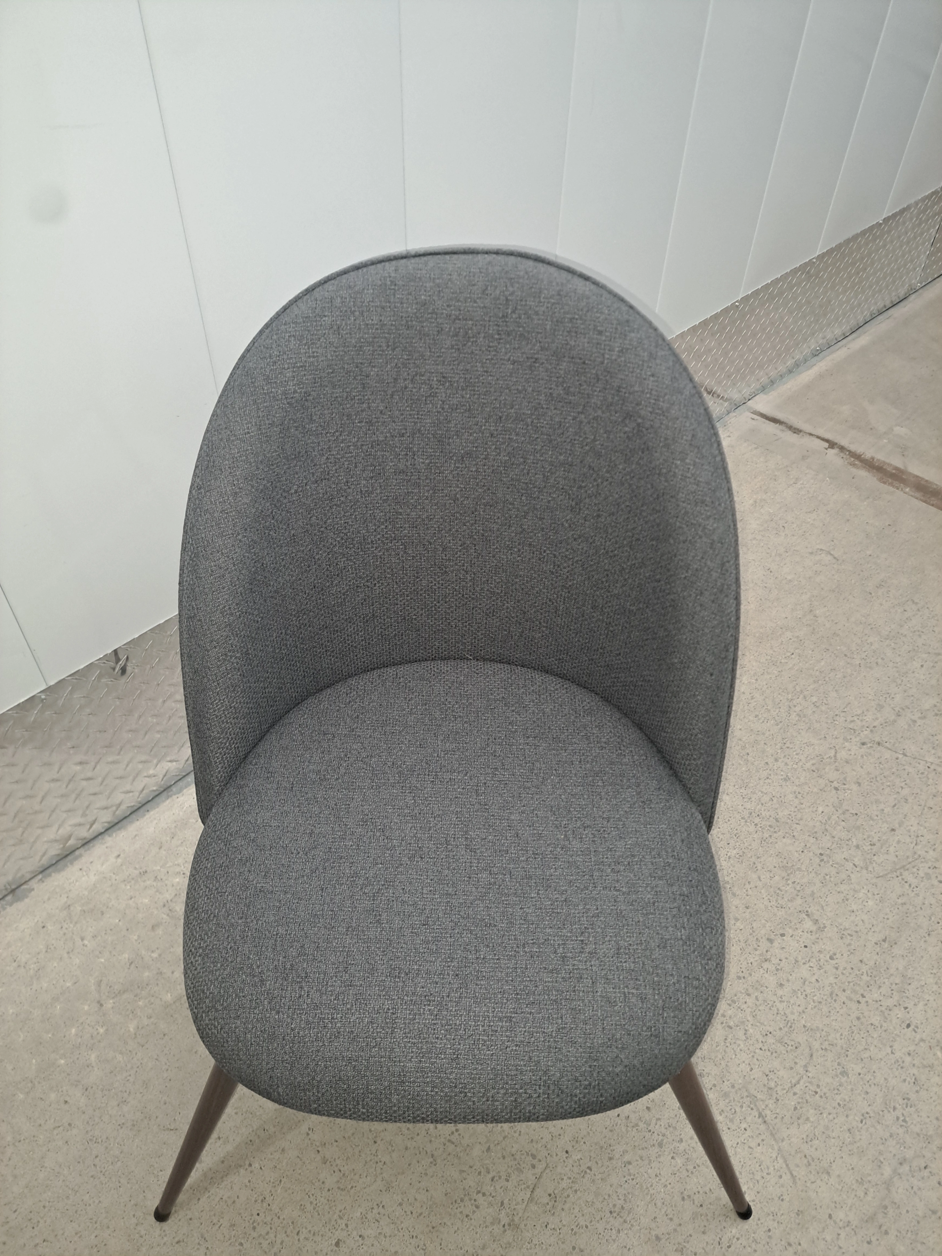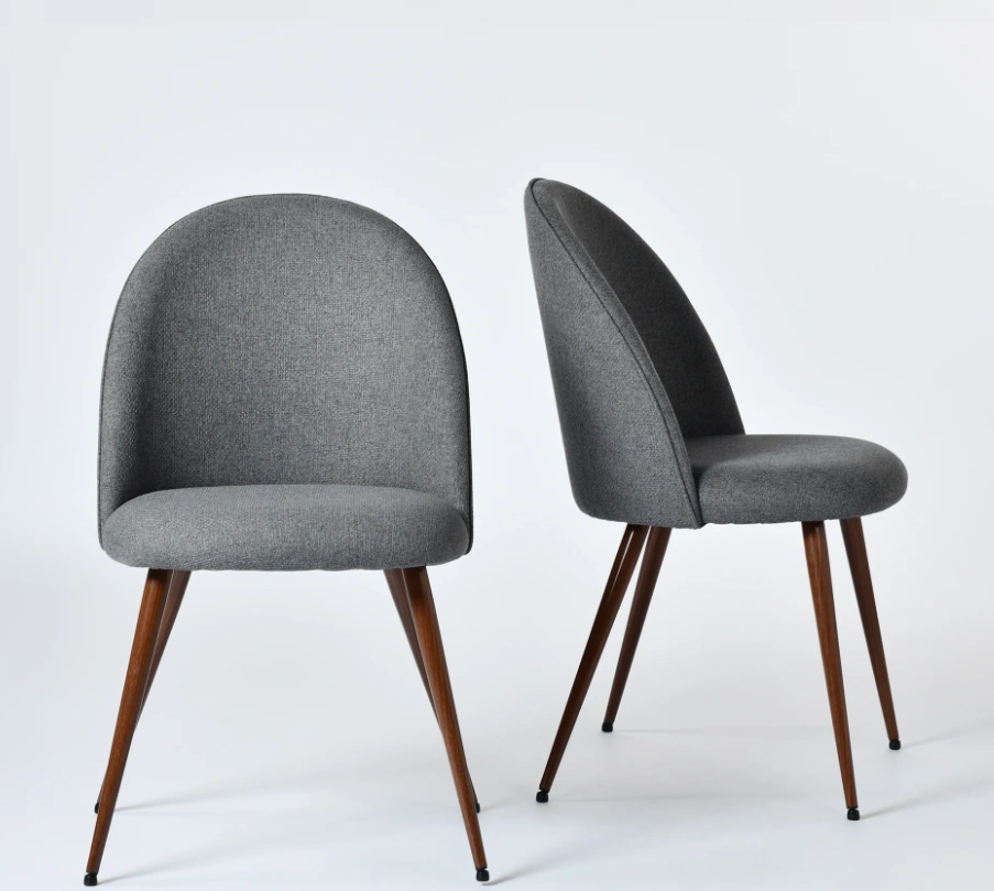 97Modern design Homicasa high-back upholstered chairs in grey Set of 4 Walnut grain powder-coated metal chair legs Space-saving design for compact dining rooms Each chair offers a high backrest and padded seat supported by walnut-finished metal legs.