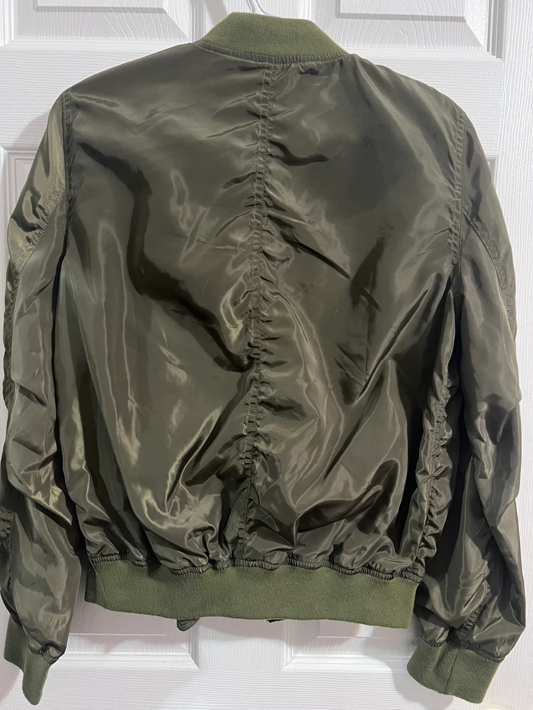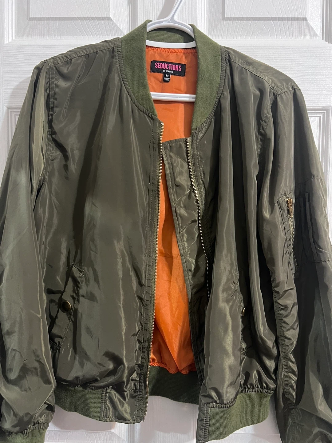 Selling a gently used Seduktions bomber jacket in olive green! It's a size medium and features a vibrant orange lining. Perfect for adding a pop of colour to your outfit while staying warm #bomber #2018 #2018fashion