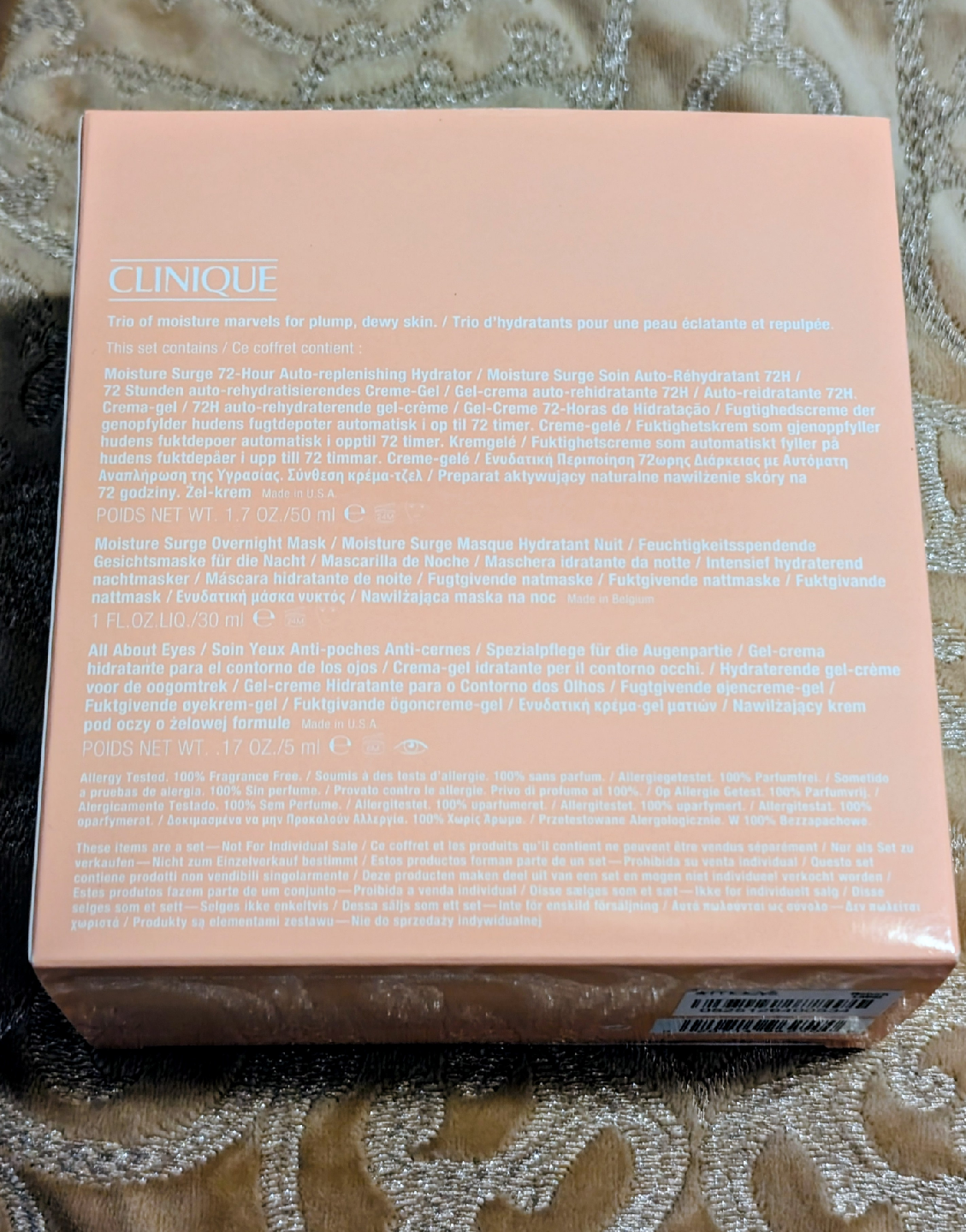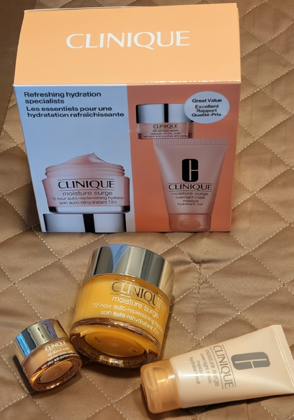 Selling a Clinique trio of moisture marvels for plump, dewy skin! This set contains Moisture Surge 72-Hour Auto-Replenishing Hydrator, Moisture Surge Overnight Mask, and All About Eyes. Perfect for refreshing hydration!