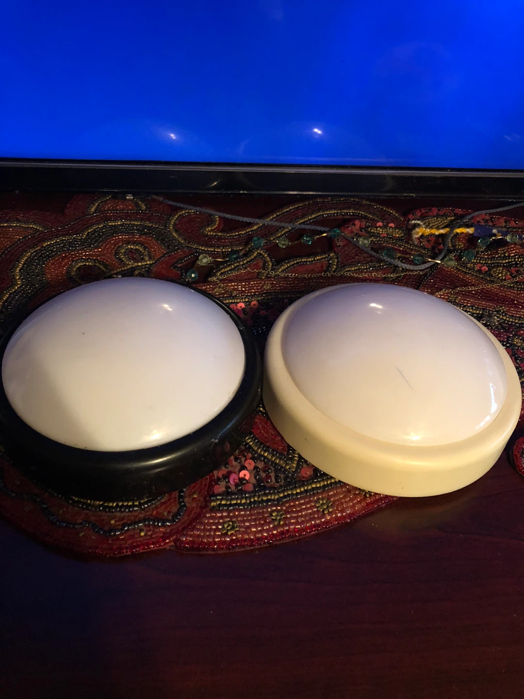 I'm selling 2 push button lamps.It's perfect for a night light or a small lamp for the closet. There are two lamps, one with a black base and one with a beige base. The condition is used but in working condition. ( batteries NOT included) 4 AA