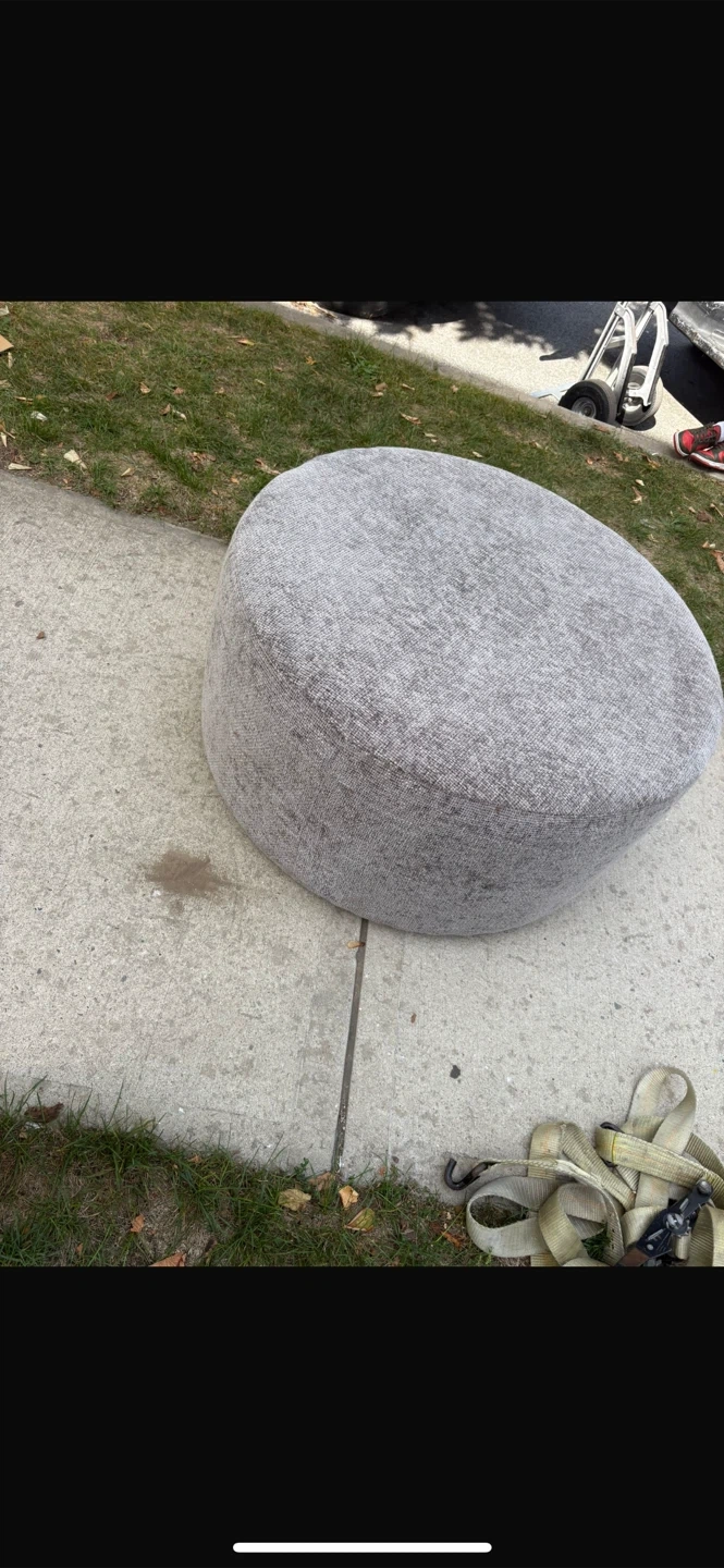 Selling a round ottoman pouf in a neutral gray color! It's in good condition and would be a great addition to any living room or bedroom. It's perfect as an extra seat or just to put your feet up!