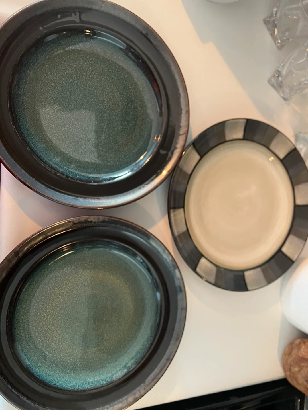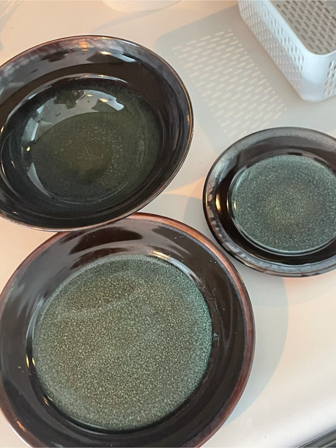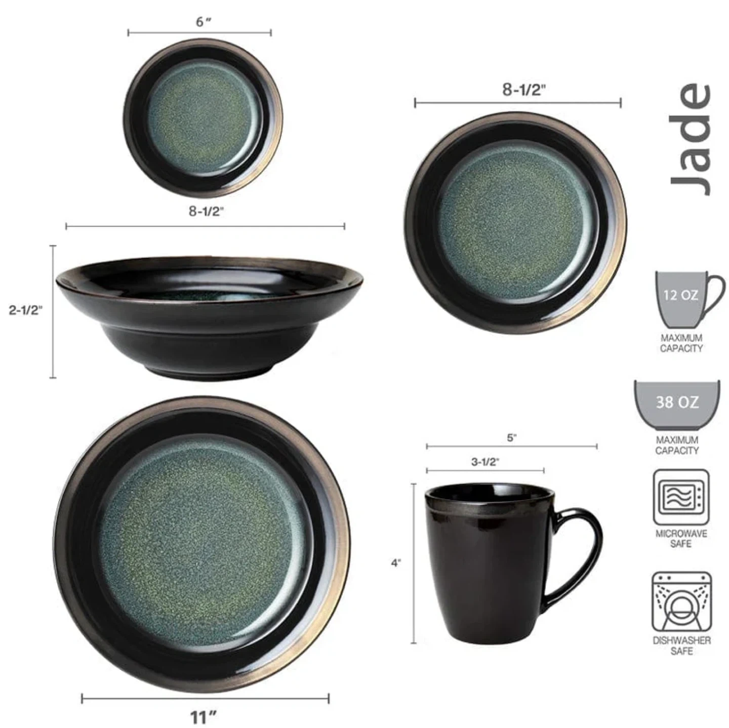 Mikasa Gourmet Basics Jade stoneware dishes. They are microwave and dishwasher safe. A couple have little chips, but still very functional.