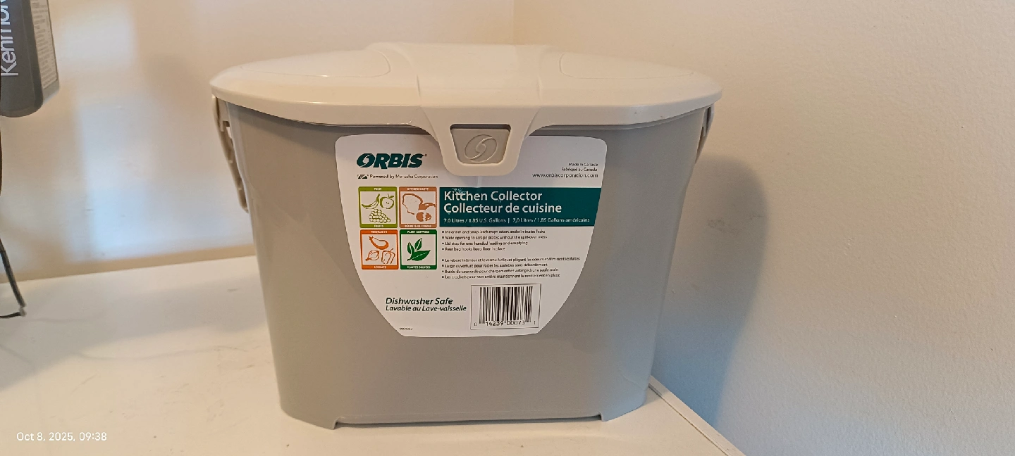 Selling an Orbis Kitchen Collector! It's a 7.0 Litre container perfect for collecting kitchen scraps. It's dishwasher safe, making it easy to clean. Great for fruits, vegetables, and plant clippings!