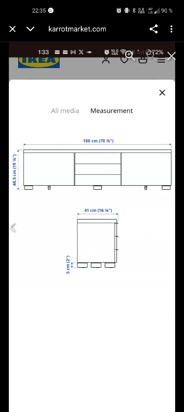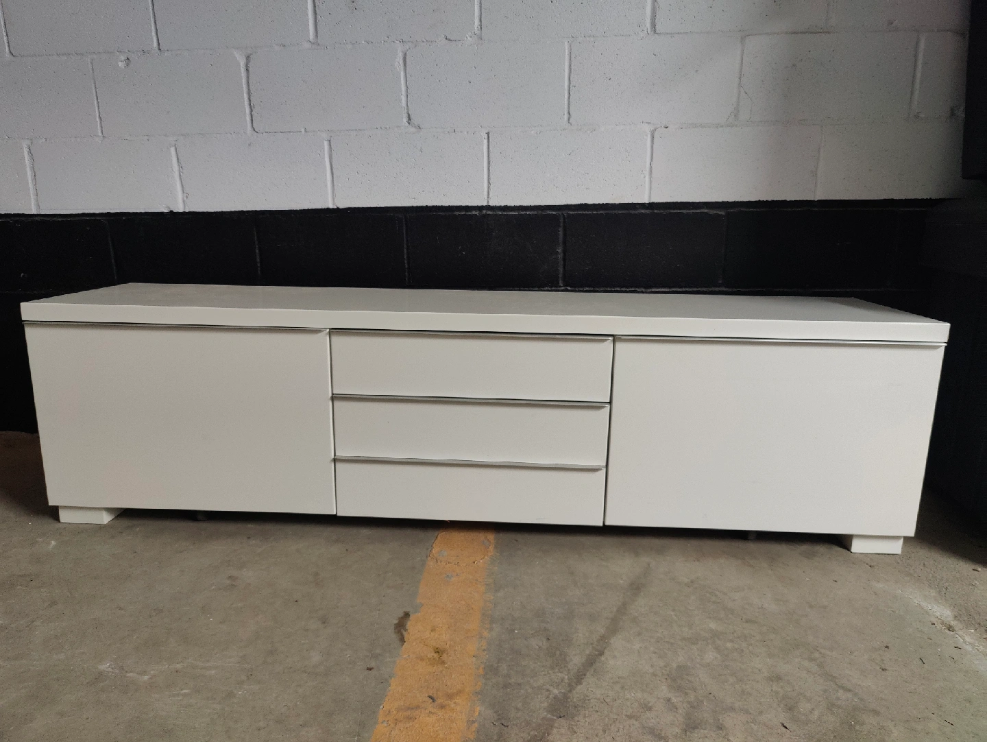 Selling a white IKEA TV stand. It has a clean look and is in good condition. The dimensions are 180 cm (70 7/8") in length, 48.5 cm (19 1/8") in height, and 41 cm (16 1/8") in depth