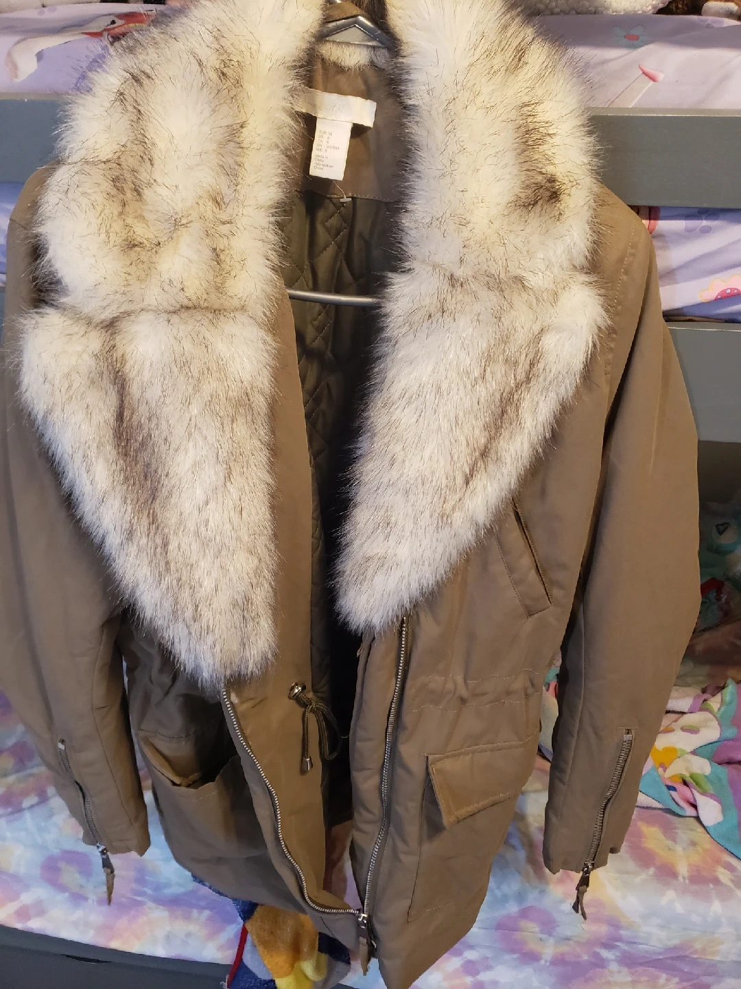 Selling an H&M parka jacket with a stylish faux fur collar! The jacket is a size 8 (US/CA). It's in great condition and only worn once for a party .