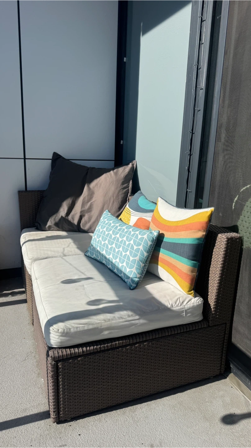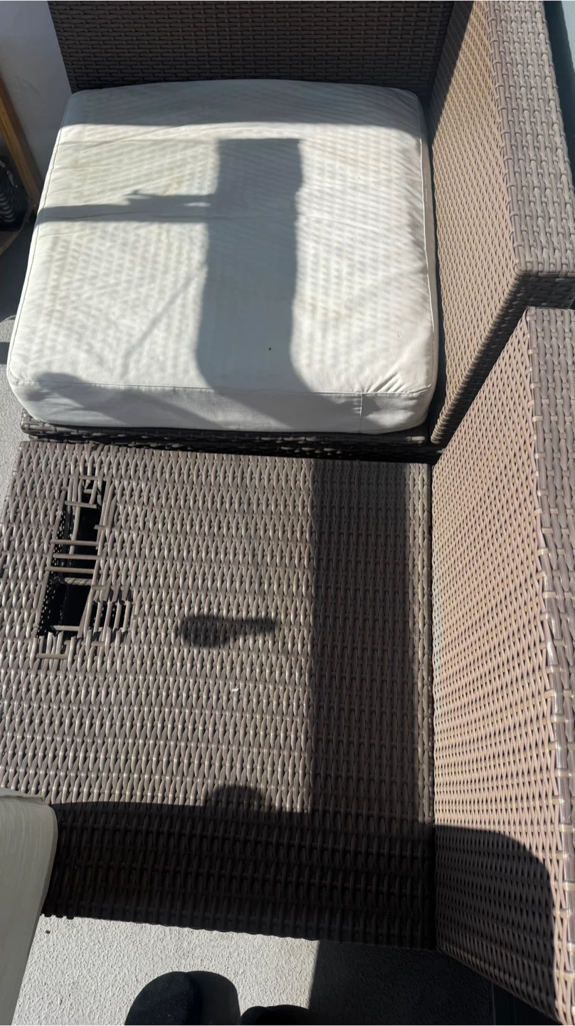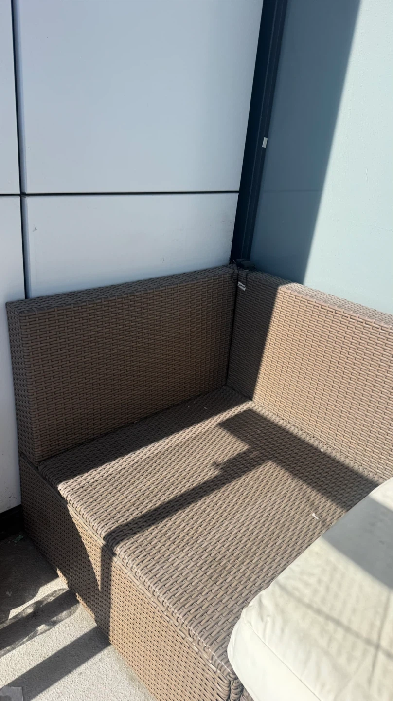Selling a brown wicker outdoor sectional sofa. It's in good condition and perfect for a balcony or patio. Can include the extra cushions shown in the photos! Damage as seen on cushions/frame. Will be washed before pick up :) very comfortable! Tear in one of the cushions & frame - price reflects