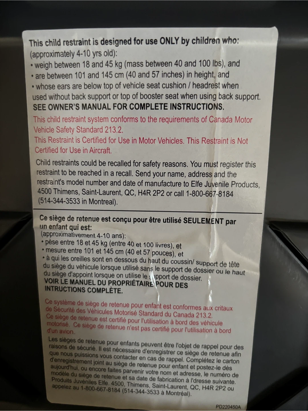 97This child restraint is designed for children who are approximately 4-10 years old. It's suitable for kids weighing between 18 and 45 kg (mass between 40 and 100 lbs), and are between 101 and 145 cm (40 and 57 inches) in height, and whose ears are below the top of the vehicle seat cushion/headrest when used without back support or top of booster seat when using back support. This restraint is certified for use in motor vehicles but not certified for use in aircraft