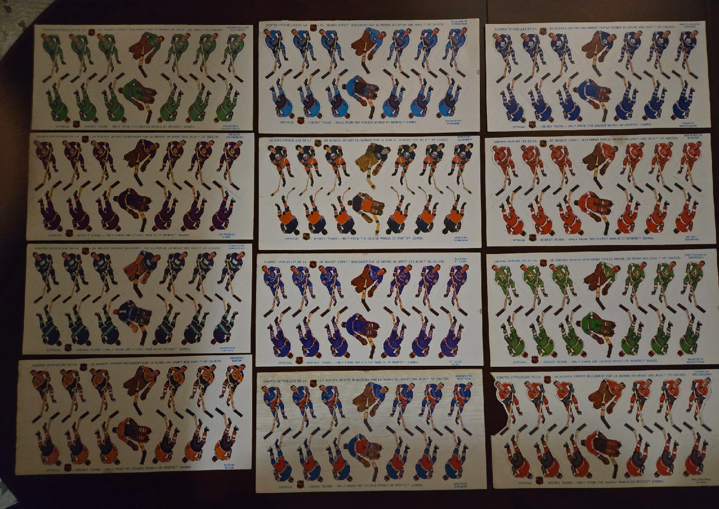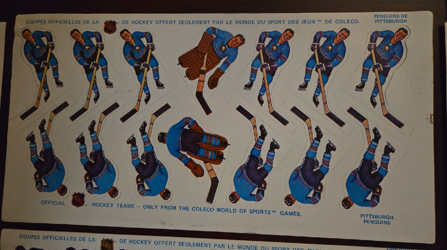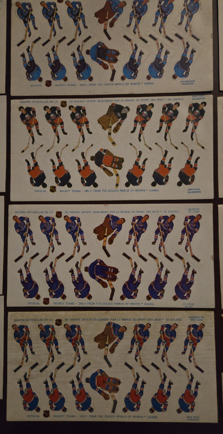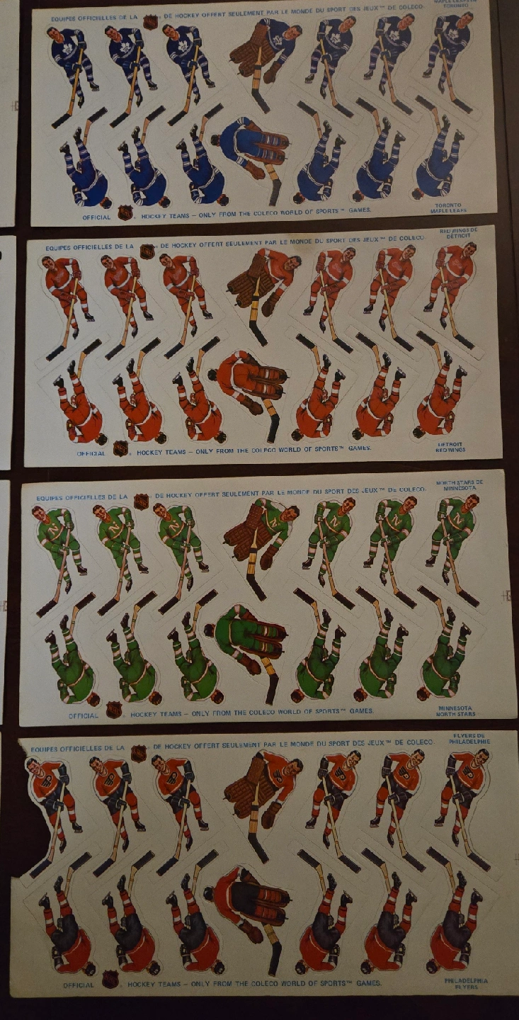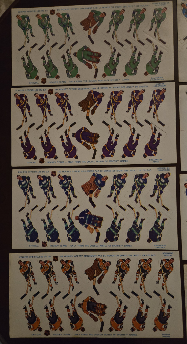 Selling 11 Very Rare Vintage Original Coleco Hockey Team sheets from the early 1970's in Great Condition, Most Sheets in Mint Condition. This was the first Coleco Team Player Sheets issued after the end of the painted on Tin Players. The players from early 70's had no helmets and most goalies with no masks. Later sets have helmets and masks. These are official NHL hockey team stickers from the Coleco World of Sports games. A cool piece of hockey history! 11 Teams Available Boston, Vancouver, Los Angeles, Golden Seals, Pittsburgh, St Louis, Rangers, NYI, Detroit, Minnesota and Philadelphia. The Leaf Sticker sheets in Photos has been sold, 11 Teams Remain. NOW ASKING ONLY $80 FIRM FOR All 11 Teams. PRICE IS FIRM.