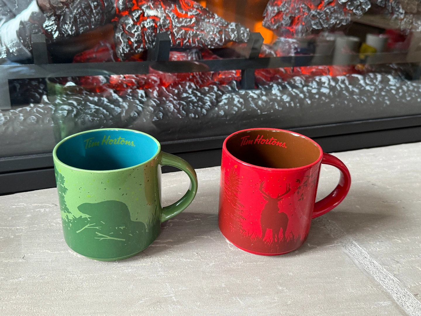 65Two Tim Hortons mugs up for grabs! One is green with a beaver design, and the other is red with a moose. Perfect for your morning coffee or tea!