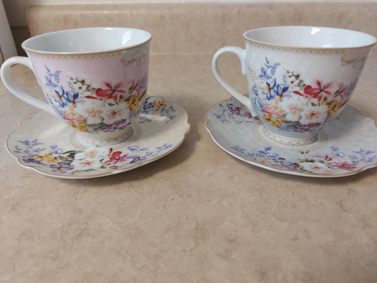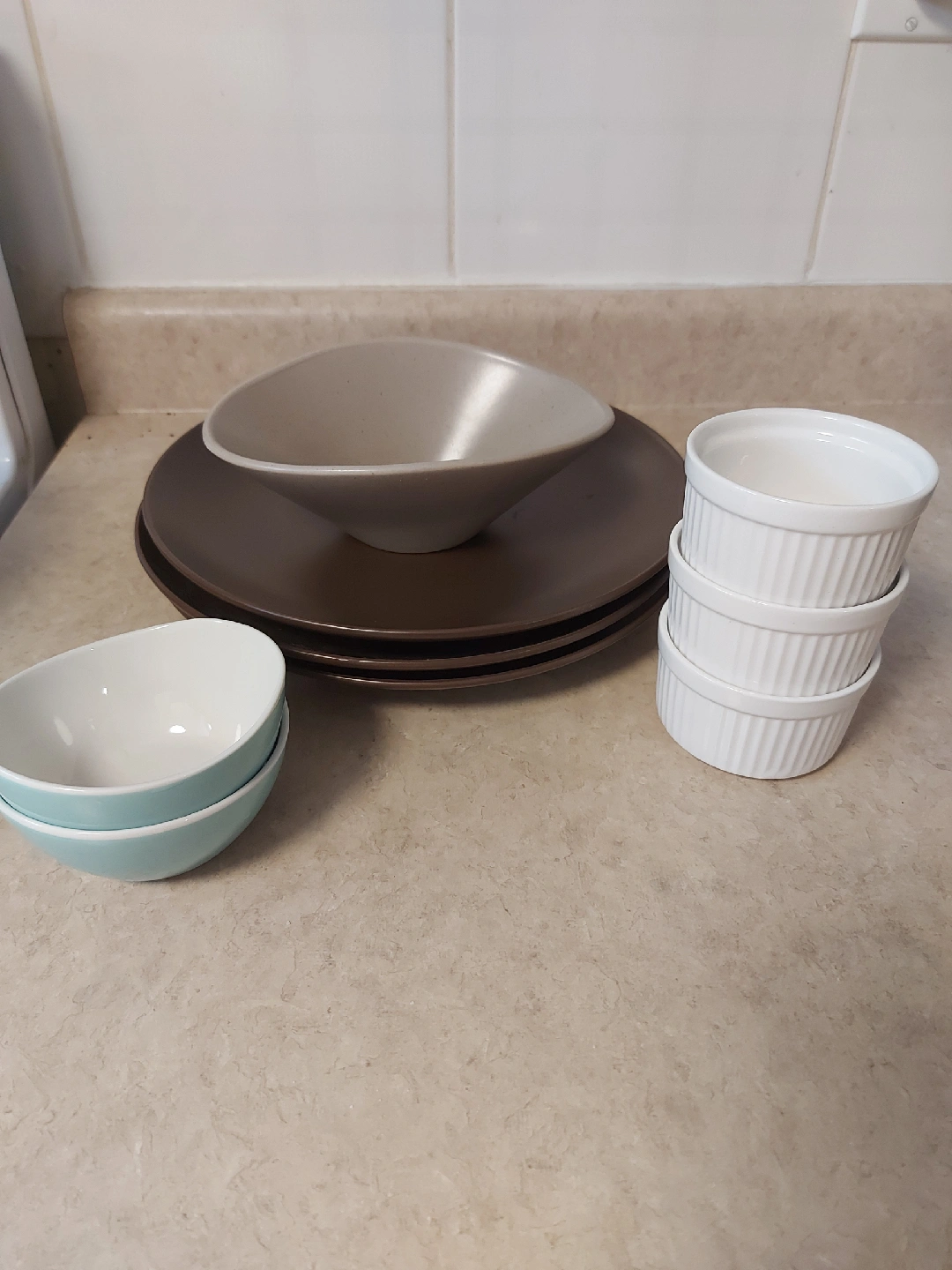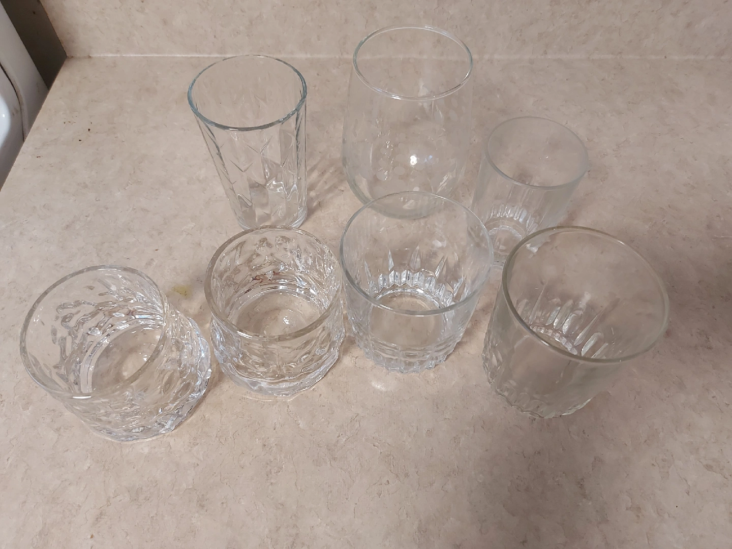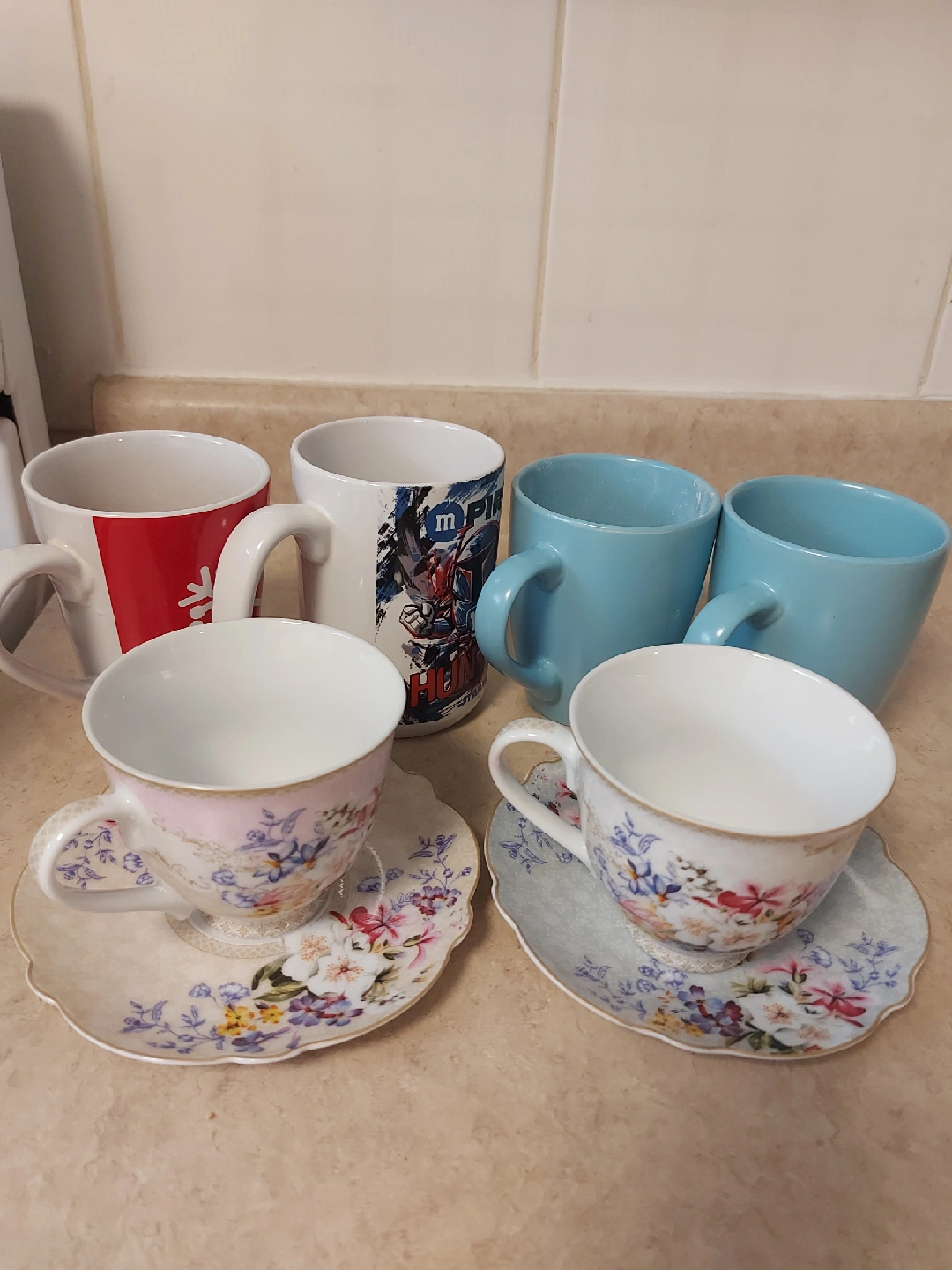 A collection of kitchenware including -saucepan with a lid -2 nonstick pots -2 teacups with saucers -7 glasses -4 mugs -2 IKEA dining plates -6 pieces of ceramic dishes -2 milk pitchers -2 stainless steel basin