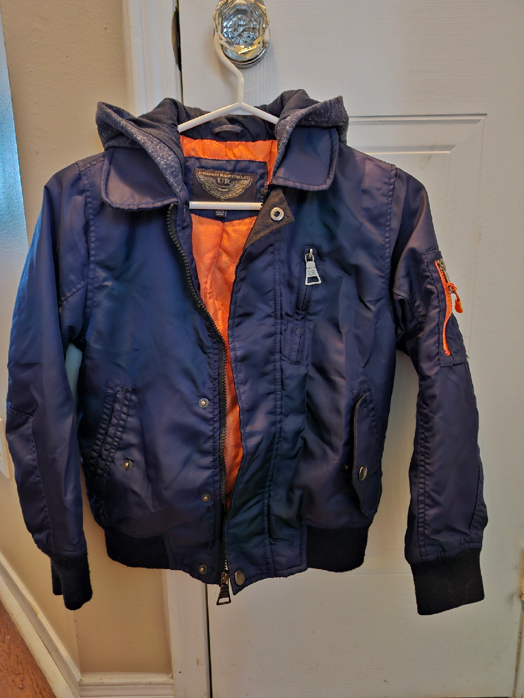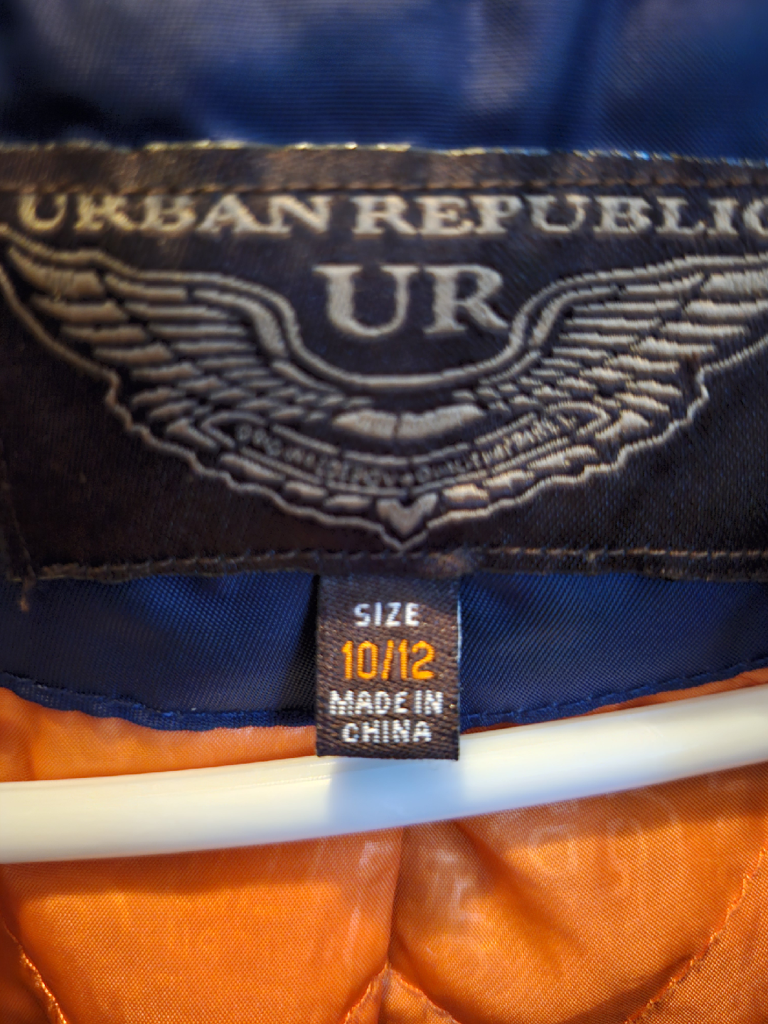 Selling a gently used Urban Republic kids' bomber jacket. It's a stylish blue colour with a cool hooded design. The size is 10/12. Perfect for keeping your little one warm and fashionable!