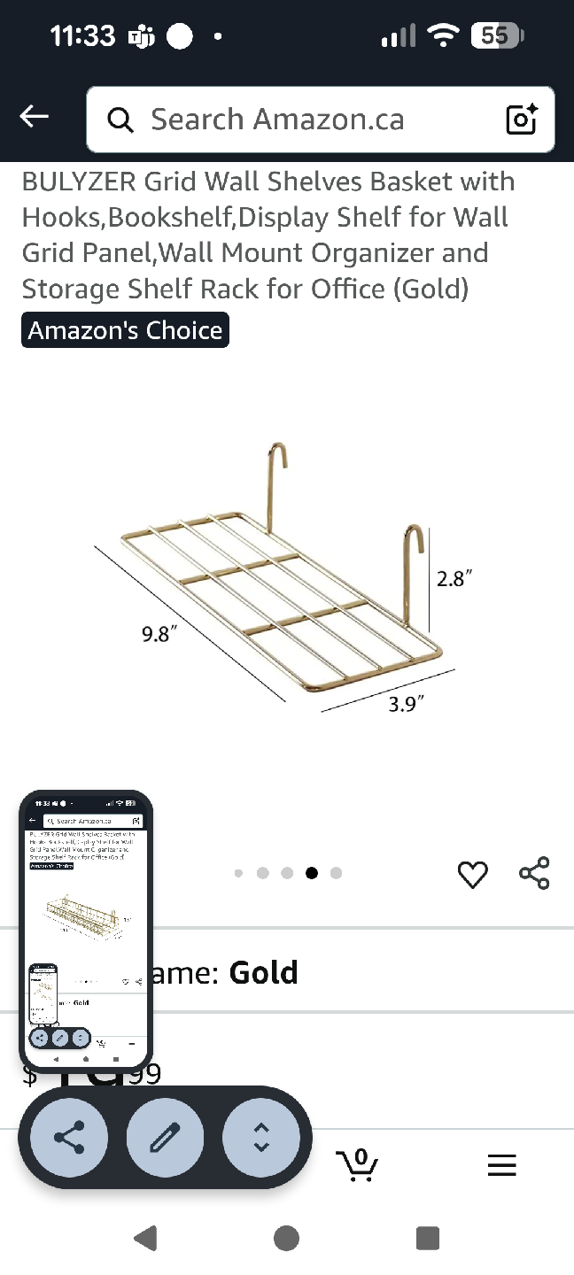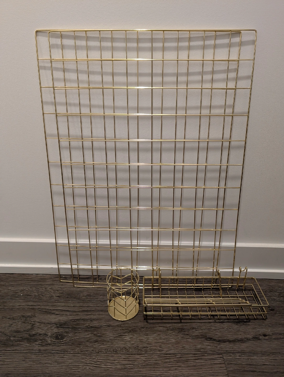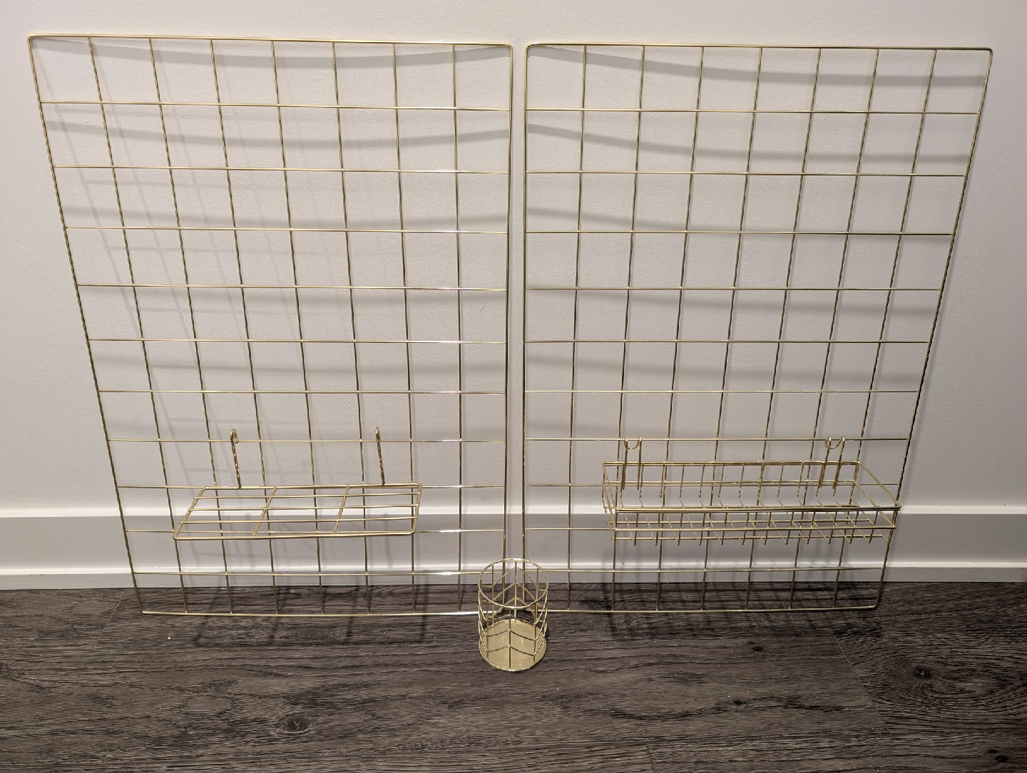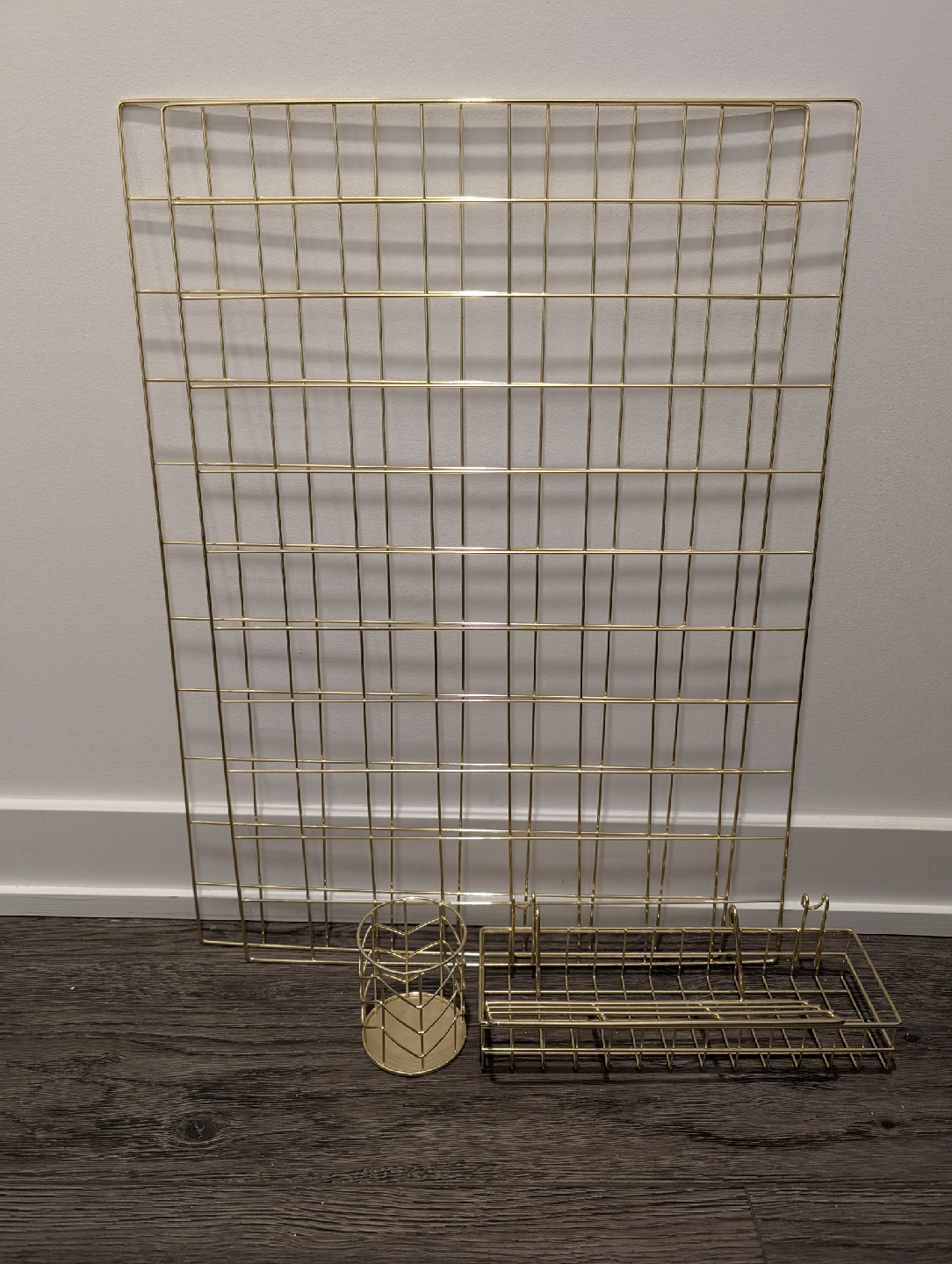 The grid panel measures 17.3" x 11.8", and the shelves are 9.8" x 3.9" and 11.8" x 3.7". Originally bought for $56.36 with tax.