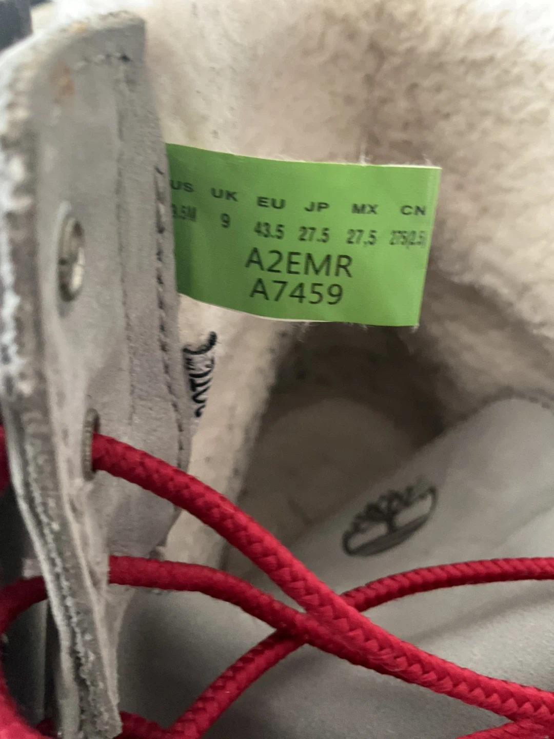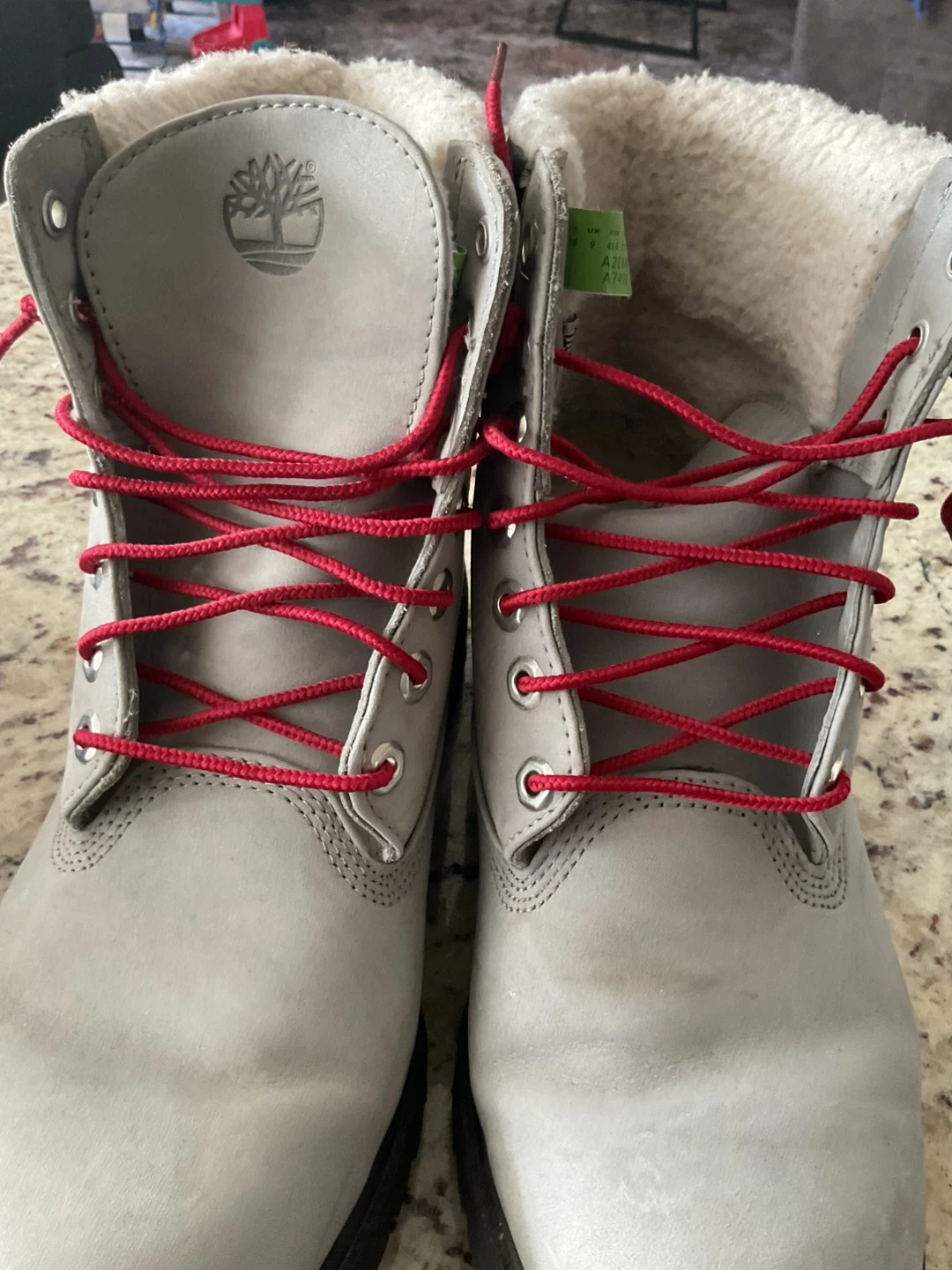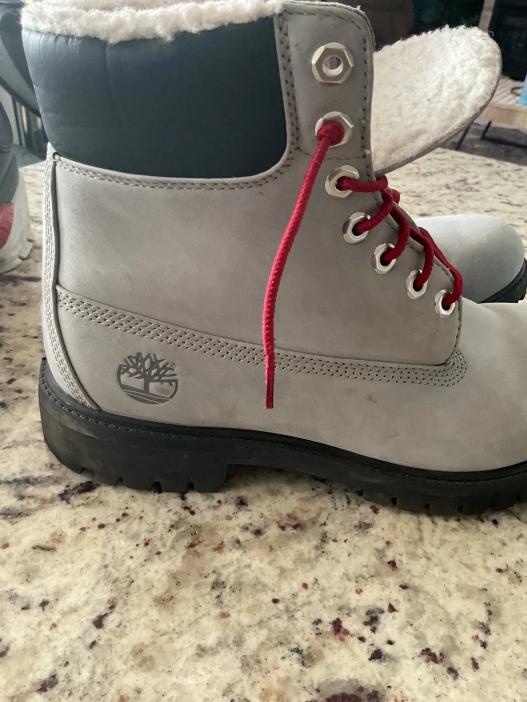 Selling a pair of Timberland winter boots in a lovely grey colour! They are in good condition and ready to keep your feet warm this winter. The boots feature red laces and the classic Timberland logo. Perfect for the Canadian weather!