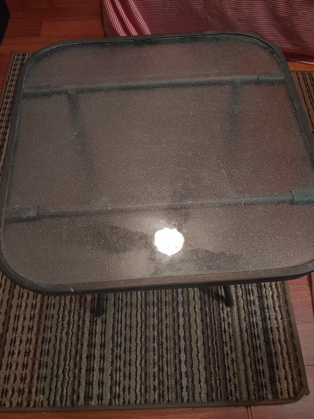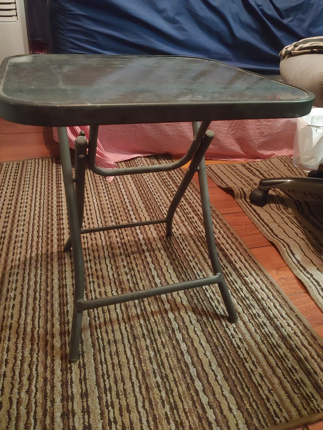 Small Glass Folding Patio Table, just needs a good clean Height = 18 inches Length = 18 inches Width = 17 inches
