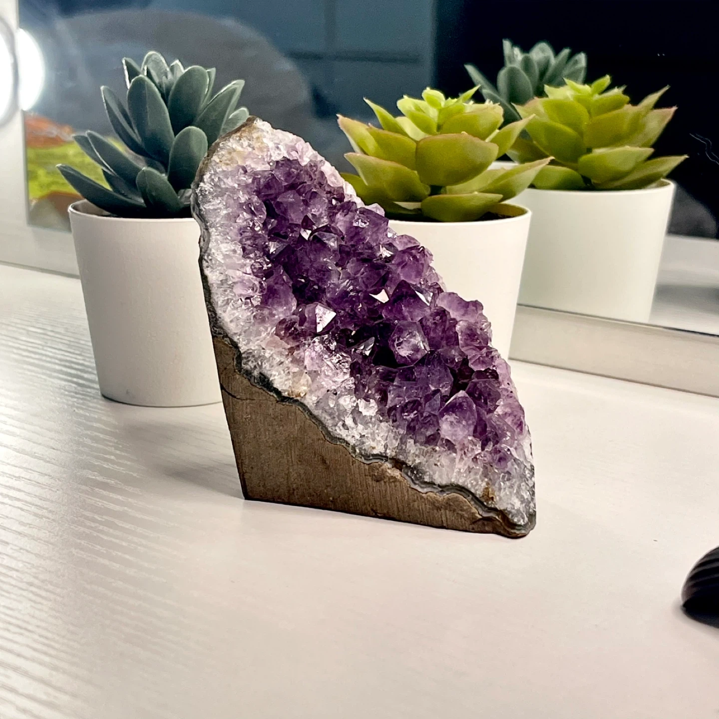 Selling a beautiful amethyst crystal cluster! It's in great condition and would look lovely as a decorative piece in your home. The crystal has a rich purple colour and a unique shape.