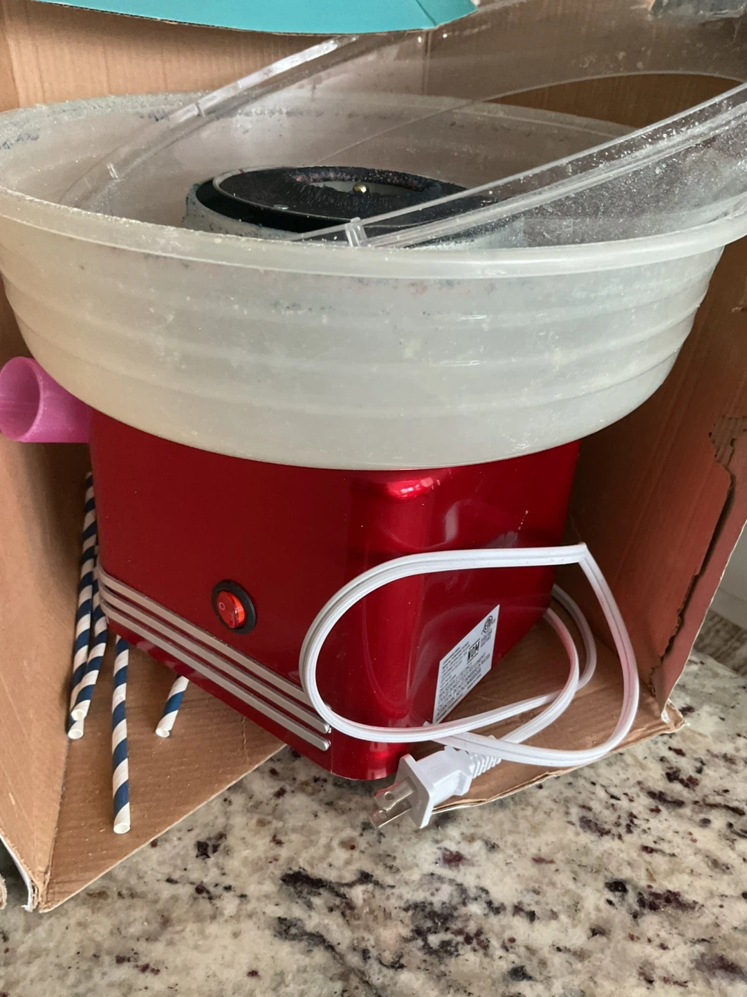 Making cotton candy is easy with this Nostalgia Retro Hard Candy Cotton Candy Maker! It works with hard candy, sugar-free hard candy, or flossing sugar. The unit disassembles for easy cleaning. It includes 2 reusable plastic cones and a sugar scoop.