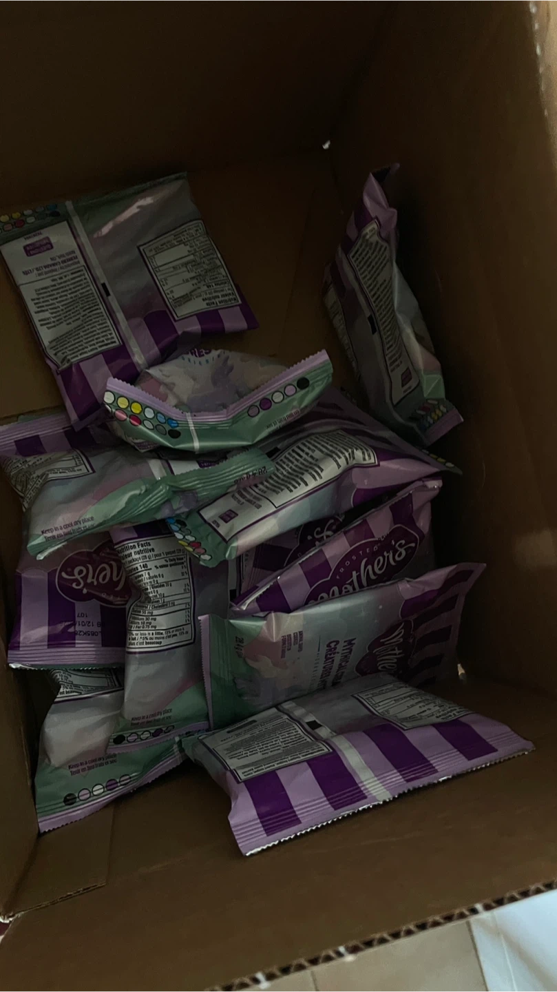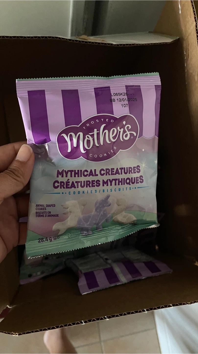 Selling a box of Mother's Frosted Cookies Mythical Creatures. These are animal-shaped cookies/biscuits. 12 pouches