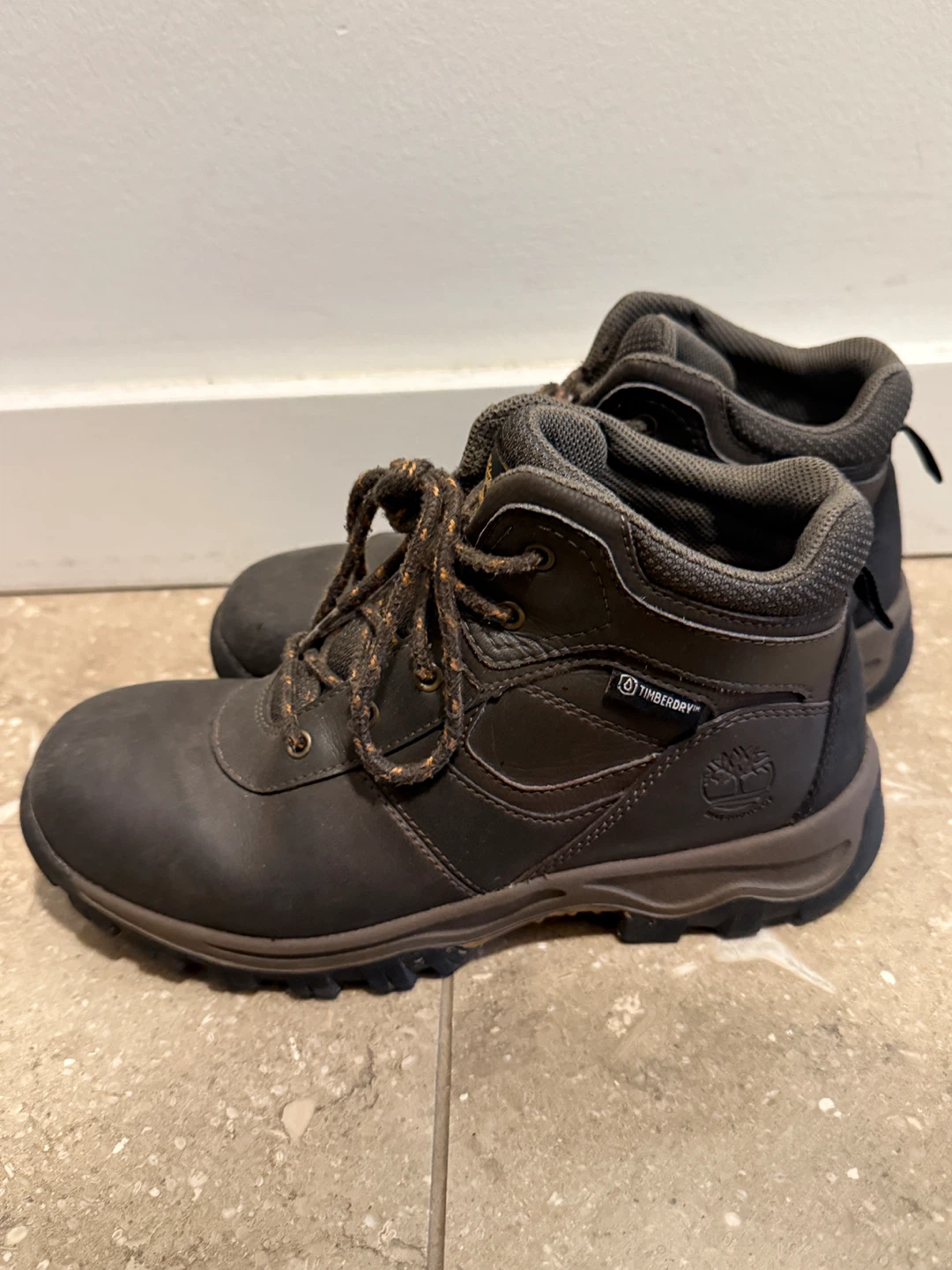 Giving a pair of kids Timberland hiking boots in brown leather. They're in good condition and ready for your next adventure! These boots are durable and comfortable, perfect for hiking or everyday wear.